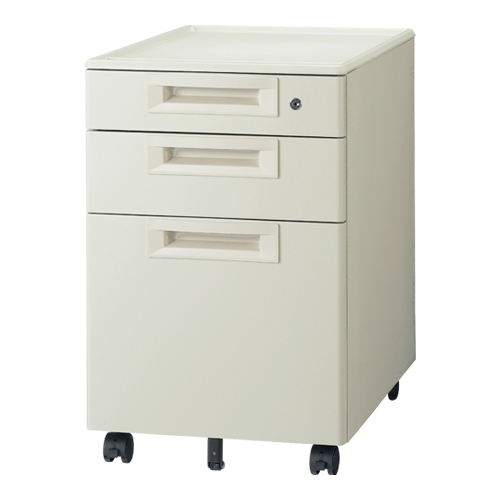| スチールデスクシリーズ「RJデスク?」サイドキャビネット3段。 ●外形寸法(幅)[mm]:396 ●外形寸法(奥)[mm]:577 ●外形寸法(高)[mm]:604 ●質量[kg]:21.7 ●色:エルグレー ●段数[段]:3 ●最大積載質量:天板=30kg、引出上・中段=10kg、下段=20kg ●仕切板枚数:S2枚、L1枚付 ●キャスター仕様:双輪キャスター(ストッパー2個付) ●機能:全段ラッチ機構、オールロック機能、転倒防止コロ付 ●付属品:ペントレー1個付 ●材質:天板=樹脂成型品、本体=鋼板(樹脂焼付塗装) ●鍵枚数:2枚 ●引出上段内寸:幅328×奥442×高75mm ●引出中段内寸:幅328×奥442×高114mm ●引出下段内寸:幅317×奥527×高295mm |