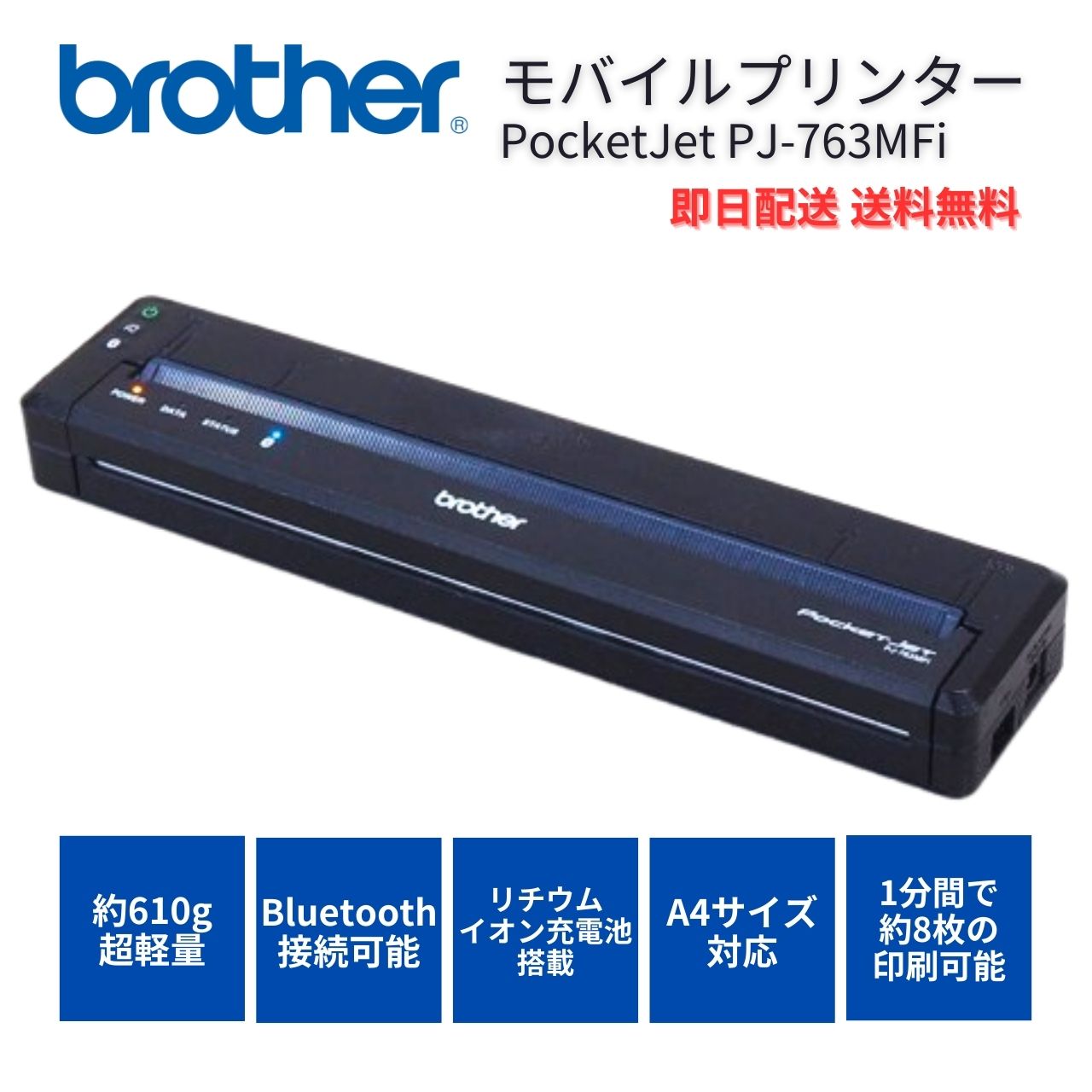 【メーカー】 brotherその他周辺機器 【型番/品名】 PocketJet PJ-763MFi A4対応小型感熱モバイルプリンター 【OS】 無し 【寸法/質量】 幅:255mm/奥行き:55mm/高さ:30mm/重量:約610g (仕様・構成により変動する場合あり) 【付属品】 ACアダプタ、充電池型コネクタ 【メーカーページ】(スペック完全一致でない場合あり) https%3A%2F%2Fwww.brother.co.jp%2Fproduct%2Fmwprinter%2Fpj763%2Fspec%2Findex.aspx 【取扱説明書】(機種・型番完全一致でない場合あり)。 https%3A%2F%2Fsupport.brother.co.jp%2Fj%2Fb%2Fdownloadtop.aspx%3Fc%3Djp%26lang%3Dja%26prod%3Des_pj763mfijp