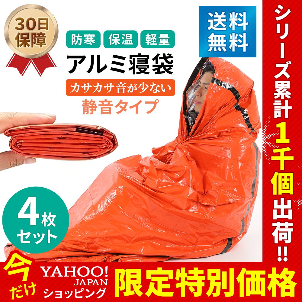 商品説明 | カサカサ音が少ない静音タイプの非常災害用のアルミ寝袋4個セットです。 防寒、保温性に優れていて、災害時や天候の急変時などに 身を守る緊急用寝袋です。 コンパクトで持ち運びやすく保管場所を取りません。 非常袋や車やバッグに常備しておけば、いざという時に寒さをしのぐことができ、大変便利です。