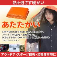 個包サイズ 約11×8cm ( 一度開くと元の状態には戻せません ) | | 重量 | 75g ( 1枚 ) | | 材質 | アルミ蒸着ポリエステル | | 使用上の注意 | 大変燃えやすい素材ですので、火気に近づけないでください。 感電の恐れがあります。電気に触れないようにご注意下さい。 通気性がない素材ですので、頭部を出してご使用ください。 雨の中や高温度の場所でのご使用の場合、長時間擦り合わせた場合、 シワや折り目などからアルミが剥離する場合がございます。 使用後の保管方法は水分や汚れなどを落とし、乾燥した場所に保管してください。 ※サバイバルシートの使用期限は購入後5年です。 | |