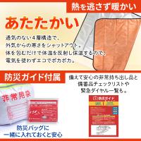 お手入れ方法 汚れた場合は柔らかい布などで水拭きをし、よく乾燥させてからご使用下さい。 湿気などの水分が付着した場合は乾いた布等で水分をよく拭き取ってください。 強くこすると剥がれたり破れたりする場合がありますのでご注意ください。 洗濯機や洗剤はご使用にならないでください。 ご使用上の注意 火や熱いものに近づけないでください。(温度が60度以上になる物と一緒にしないでください) 本製品のご使用中に寝具内に湿気がこもる場合がありますので、寝具を乾燥させてからご使用下さい。 布団乾燥機をご使用になる際は本製品を外した状態でご使用下さい。 先の尖ったものや硬いもので擦ると敗れる場合があります。 生地の特性上、角度によって白く光って見える場合がありますが、保温・生地の強度などに問題はありません。 本製品は通気性が無いので顔を覆ったりしないでください。特にお子様がご使用になる場合は、大人の方が付き添ってご使用下さい。 開封後に原材料由来の臭いが多少感じられるときがありますが、使用後は徐々に消えていきます。 また臭い成分には危険物が含まれておりません。臭いが気になる場合は、日陰干しなどをおすすめします。 | | カラー | ・オリジナルカラー 表面:シルバー 裏面:オレンジ | | サイズ | サイズ : 約180 × 140cm ダブルサイズ 個包サイズ 約30 × 25 × 3cm | | 重量 | 重量 : 225g ( 1枚 ) | | 材質 | アルミ、不織布 | | 使用上の注意 | 大変燃えやすい素材ですので、火気に近づけないでください。 感電の恐れがあります。電気に触れないようにご注意下さい。 通気性がない素材ですので、頭部を出してご使用ください。