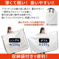 商品説明 | 緊急非常時や災害時、スポーツ観戦時などにブランケットの代用としてご使用いただける、カサカサ音が少ない、コンパクトなアルミ4層ブランケット( サバイバルシート エマージェンシーシート EMERGENCY SHEET ) 1枚です。 急な気温変化や災害などの緊急時に対応するために開発されたアルミの簡易毛布保温シートです。 薄くて軽いので、防災リュック、車の中などに常備でき、持ち運びやすく場所を取りません。 広げると 140 × 180 cm のゆったりダブルサイズになりますので、毛布のように被ったり、 ベッドやマット、布団の下に敷いたりと様々な使い方が可能です。 熱を逃がさない4層構造なのでいざという時にはサッと広げて 寒さをしのぐことができ大変便利です。電気を使わずエコでポカポカ。 毛布として、キャンプ等テント内で寝袋インナーやテントシートの代わりとして、 体温を逃がさない目的にご使用頂けます。 アルミシートを外側に向けて使用すると外からの温度の侵入を防ぐことができます。 ブランケットのみでご使用になる場合、アルミ面を外側、不織布面を内側にしてご使用下さい。 掛け布団・毛布と共に体の上にかけてご使用になる場合、アルミ面を外側、不織布面を内側にして ご使用下さい。また掛け布団と毛布の間に本製品を挟んでご使用下さい。 シーツと共に体の下に敷いてご使用になる場合は、アルミ面を上にして下さい。また本製品と 体の間にシーツを敷いてご使用下さい。 ※アルミ4層ブランケットには通気性がございません。そのためシーツと共にご使用されることを 推奨いたします。 ※ご使用以外の場合、乾燥した場所に保管してください。カビや汗などで嫌な臭いの原因にもなります。