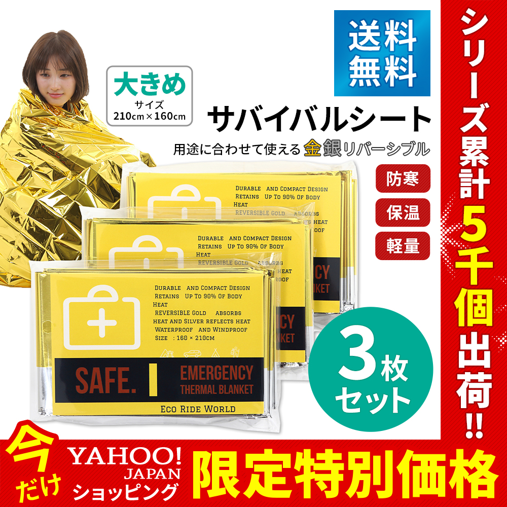 緊急災害時やアウトドアなどに毛布の代用としてご使用いただける、コンパクトなサバイバルシート ( アルミシート ) 3個セットです。