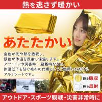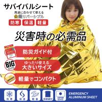 緊急時での寒さ対策以外に、登山やスポーツ観戦にも常備しておくと便利です。 | | | カラー | ゴールド(表面はゴールド、裏面はシルバー) | | | サイズ | 約210 × 160cm | | | 重量 | 約50g (1枚あたり) | | | セット内容 | サバイバルシート3個 | | | 材質 | アルミ蒸着ポリエステル | | | 使用上の注意 | 大変燃えやすい素材ですので、火気に近づけないでください。 感電の恐れがあります。電気に触れないようにご注意下さい。 通気性がない素材ですので、頭部を出してご使用ください。 雨の中や高温度の場所でのご使用の場合、シワや折り目などからアルミが剥離する場合がございます。 長い時間、擦り合わせた場合、アルミ箔が粉状に出る場合がございます。 使用後の保管方法は水分や汚れなどを落とし、乾燥した場所に保管してください。