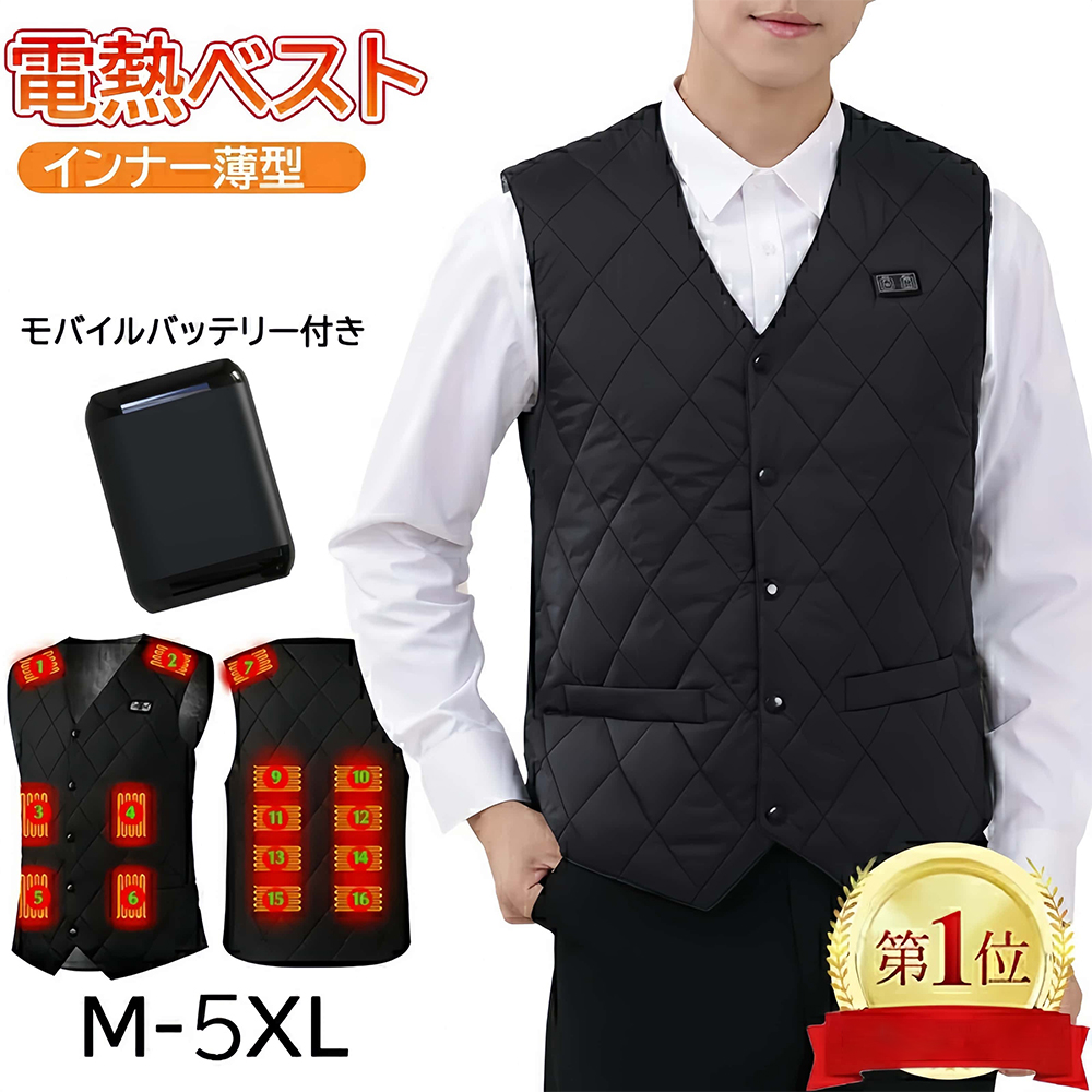 電熱ベスト インナー 電熱インナー Vネック 16枚ヒーター モバイルバッテリー付き ヒーターベスト インナー 男女兼用 電熱ベスト 薄手 温度調整3段階 洗濯可