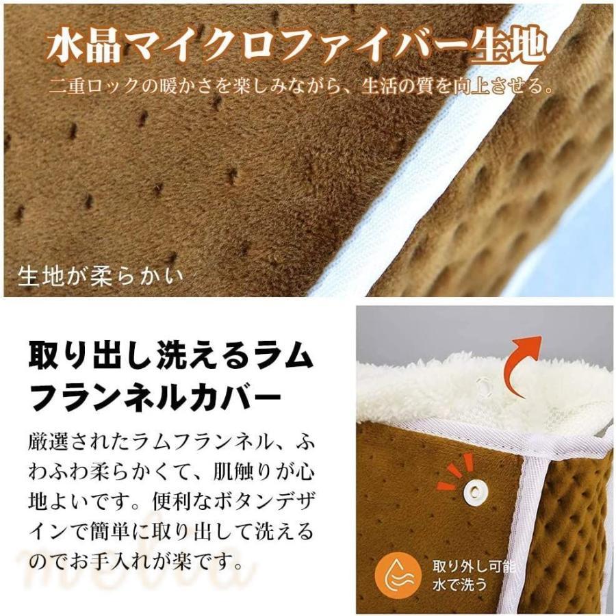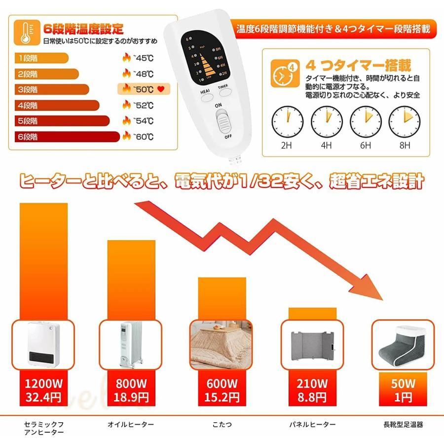 40℃-60℃範囲に6つ段階に調節できます、実際状況によってご自由に温度を切り替えます。速暖機能を付き、すぐ温めることができます。また、タイマー機能を付き、時間は 2H / 4H / 6H / 8Hで自由に選択できます。時間になると、電源が自動的に切れ、非常に安全で火事の心配はいりません。