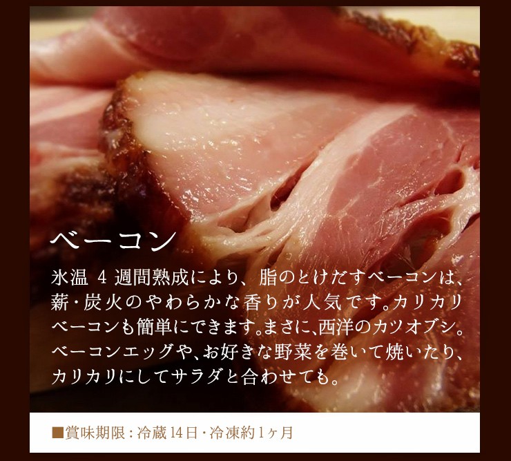 長期漬込み法により、他では決して味わえない脂身のとろける美味しさと、薪・炭火のやわらかな燻煙の香りは、初めて召しあがる方にも格別の美味しさを実感していただけます。「人気商品」だけを組み合わせた内容は、きっと皆様に満足していただけると思います。 セット内容 ベーコンブロック:280g スモークスペアリブ:280g ロースハム:280g 焼豚:280g 【国内唯一の製法】ドイツ人マイスターも驚く幻の古典製法&4週間に及ぶ氷温熟成ハムベーコン 一流シェフ、デパートカリスマバイヤーも絶賛する技と美味しさ♪ イベントでベーコン串を販売すると長蛇の列!2000本が3時間で完売してしまうほど人気 お歳暮、ご挨拶、出産祝い、快気祝い、結婚祝い、入学内祝い、新築祝い、お祝い、プレゼント、婚礼、結婚式、ブライダル、出産、ノベルティ、記念品、粗品、ゴルフコンペ、来場記念、成約記念、贈り物、法事、法要、仏事、お香典返し、引き出物、お返し、景品、などイベントやご用途にあわせたギフトにご利用いただけます。