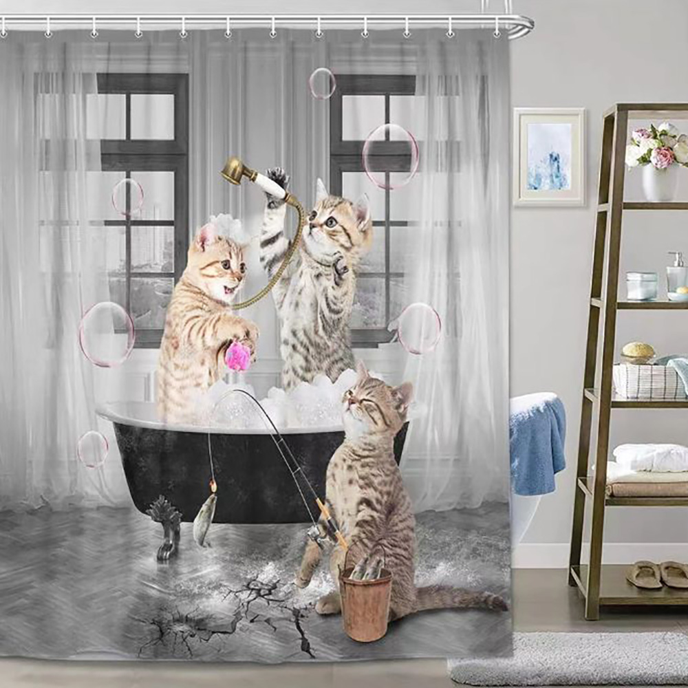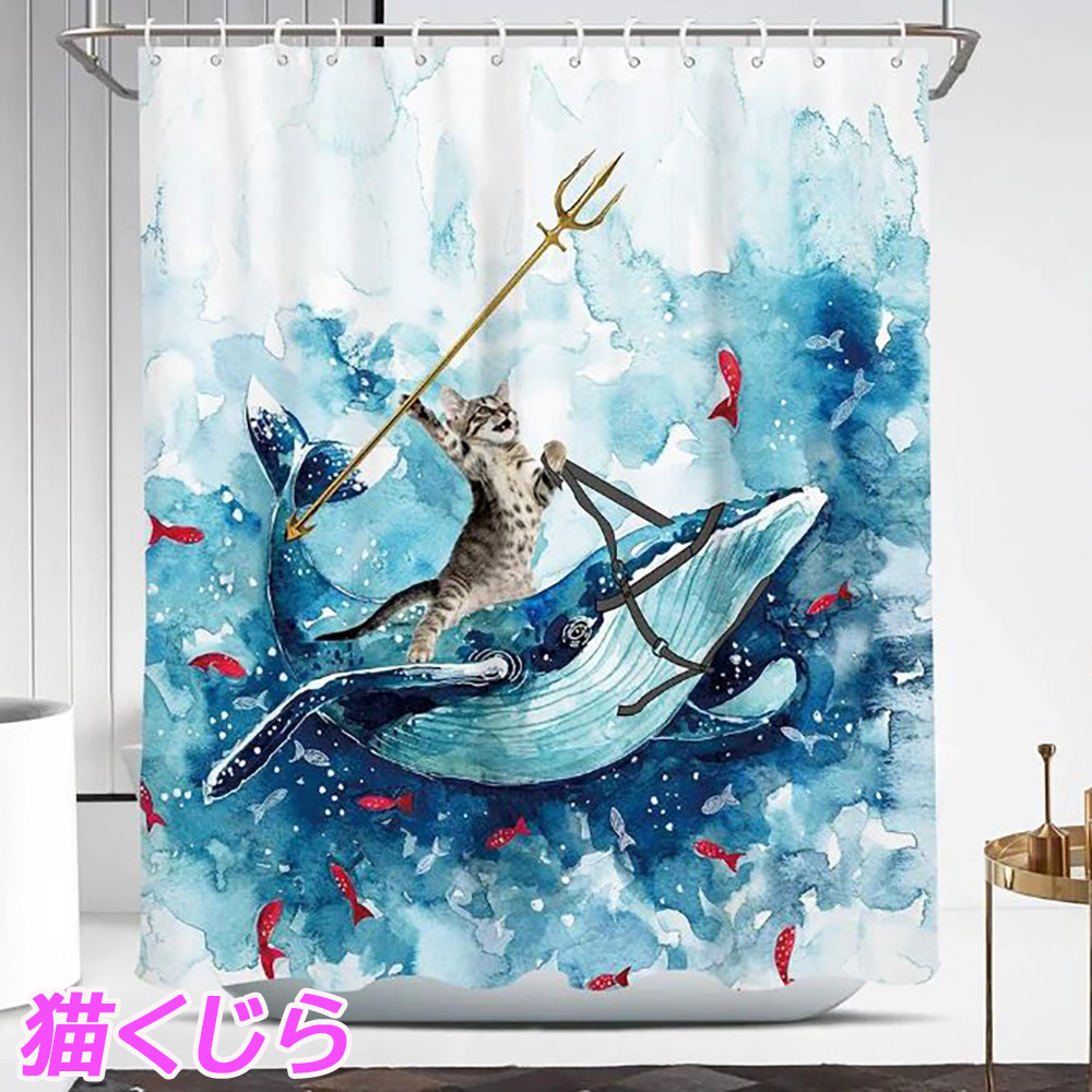 【商品詳細】 素材:ポリエステル 仕様:撥水 防カビ パッケージ内容:猫柄シャワーカーテン+カーテンリング