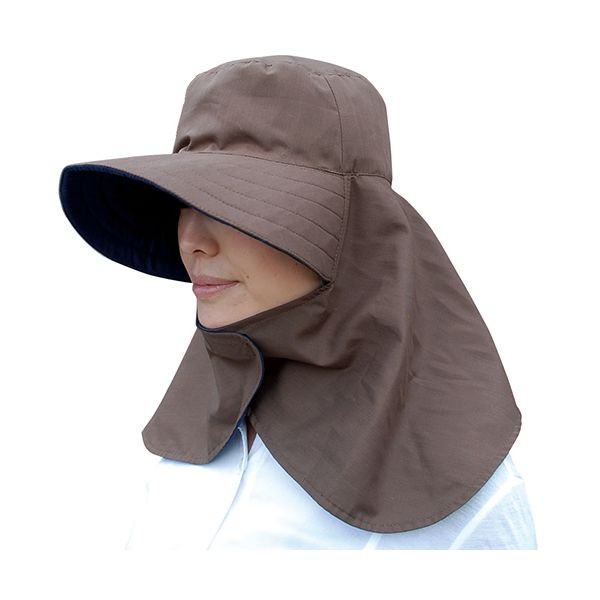 【用途】園芸作業用ハット。【機能・特徴】蚊などの虫が嫌がる防蚊加工を施しています。フード付で日焼け予防でき、コーディネートしやすいリバーシブルタイプです。忌避成分をマイクロカプセル化し、生地表面にコーティング、マイクロカプセルが破れる際に忌避成分を発散します。広めのツバで首もガードします。【仕様】●色:ブラウン×ネイビー。●防蚊加工。●リバーシブル。●ポリエステル。●綿。園芸用品 保護具補助具 園芸ウェア