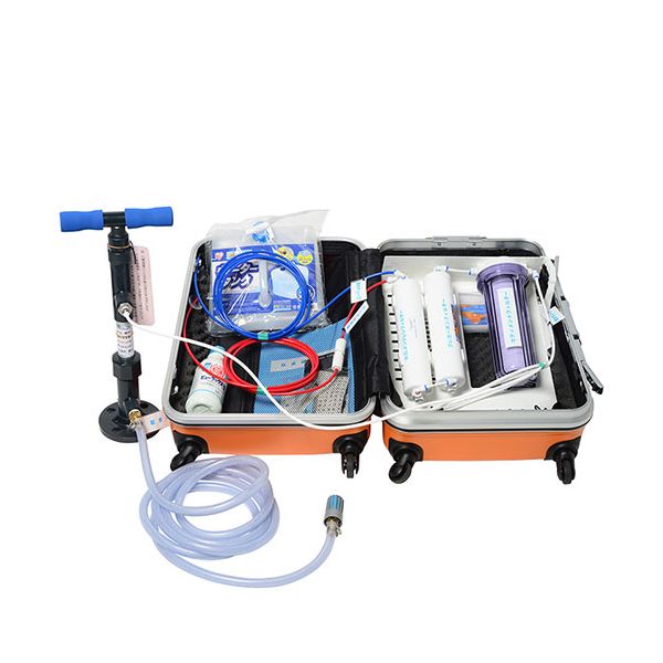 浄水装置一式がキャリーケース内に収納されていて、電源やガソリンを必要とせず、その場で手動により水を確保することが可能です。