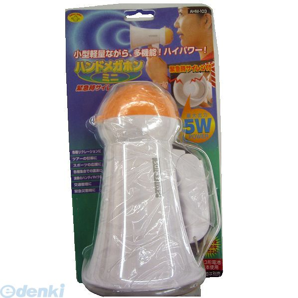 旭電機化成 AHM-103 ハンドメガホンミニ 【特徴】 携帯に便利なミニサイズの電池使用の本格ハンドメガホンです。最大出力5Wのハイパワーな音量で、いろんな場面で便利に使えます。緊急時や事故時には大音量のサイレンに切替えられます。 ●【仕様】 電池寿命(時間) / 国産アルカリ乾電池使用時/約28(ボリューム中間位置で連続使用) 非防水 使用電池 / 単3形乾電池6個 (別売り) ●【サイズ(高さ)ミリ】 260 ●【サイズ(幅)ミリ】 141 ●【サイズ(奥行)ミリ】 102 ●【重量(グラム)】 322