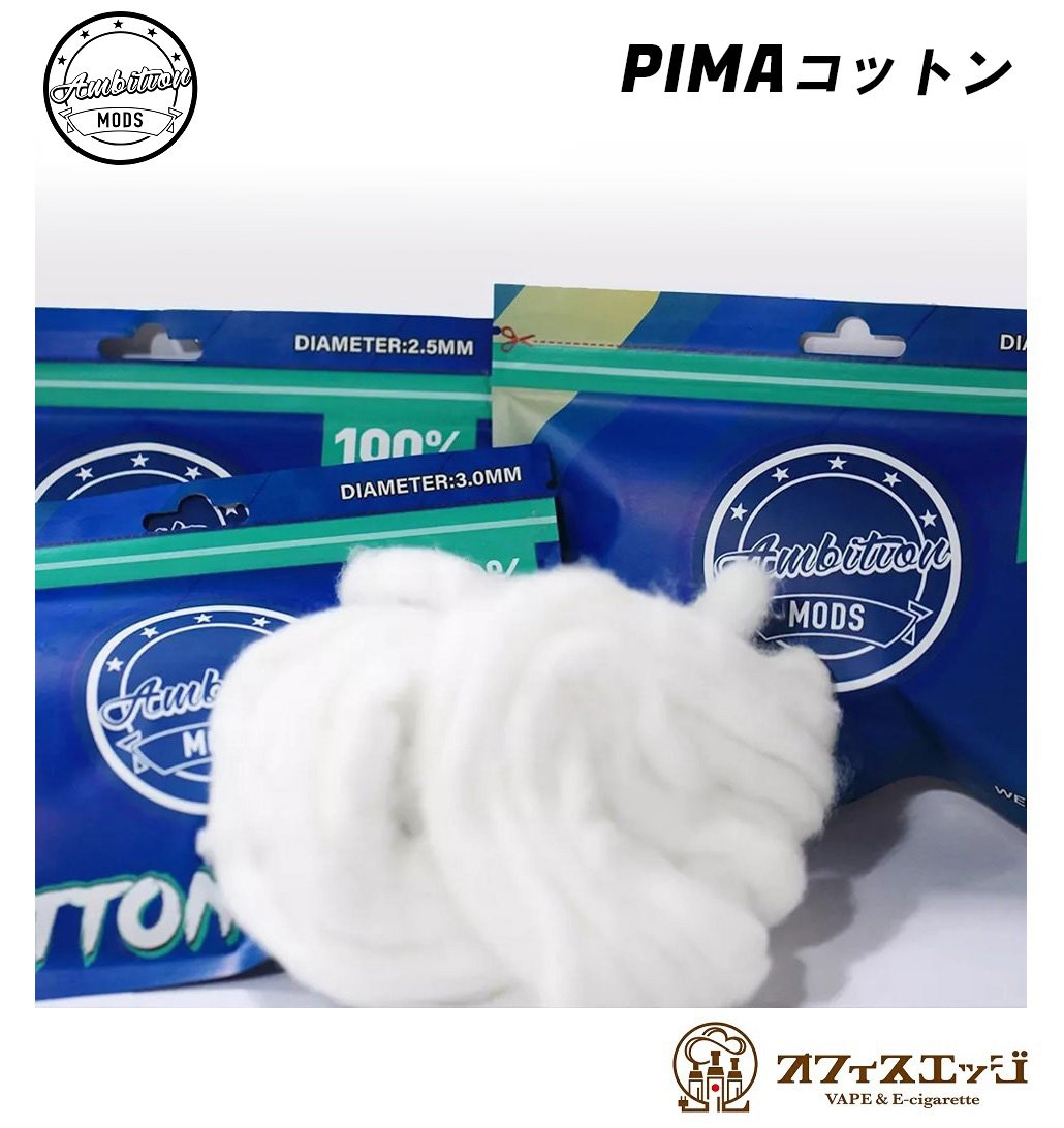 Ambition Mods PIMAコットン100%プレミアムオーガニックの長繊維コットンです。吸収速度が速く、高温に対する耐性が優れていることも特徴です。2.5mmおよび3mmバージョンがあります。製品の特徴:重量:10g長さ:7メートル原材料:プレミアムオーガニックコットン100%繊維の種類:長綿 フロックの少ない丈夫な繊維吸収:高速・大容量耐性:高温耐性高速フレーバー切り替え速い吸湿発散速度フロックの少ない丈夫な繊維