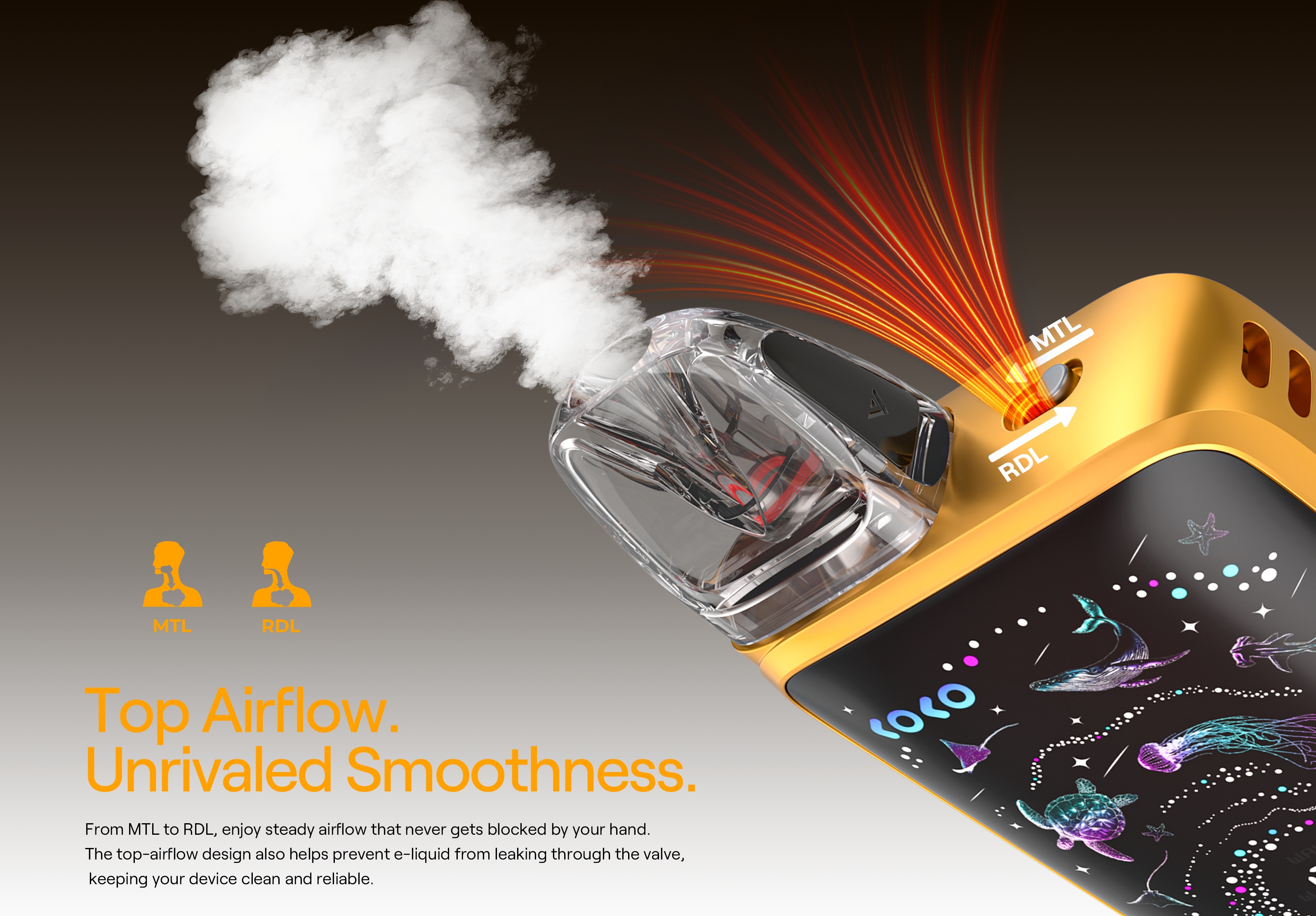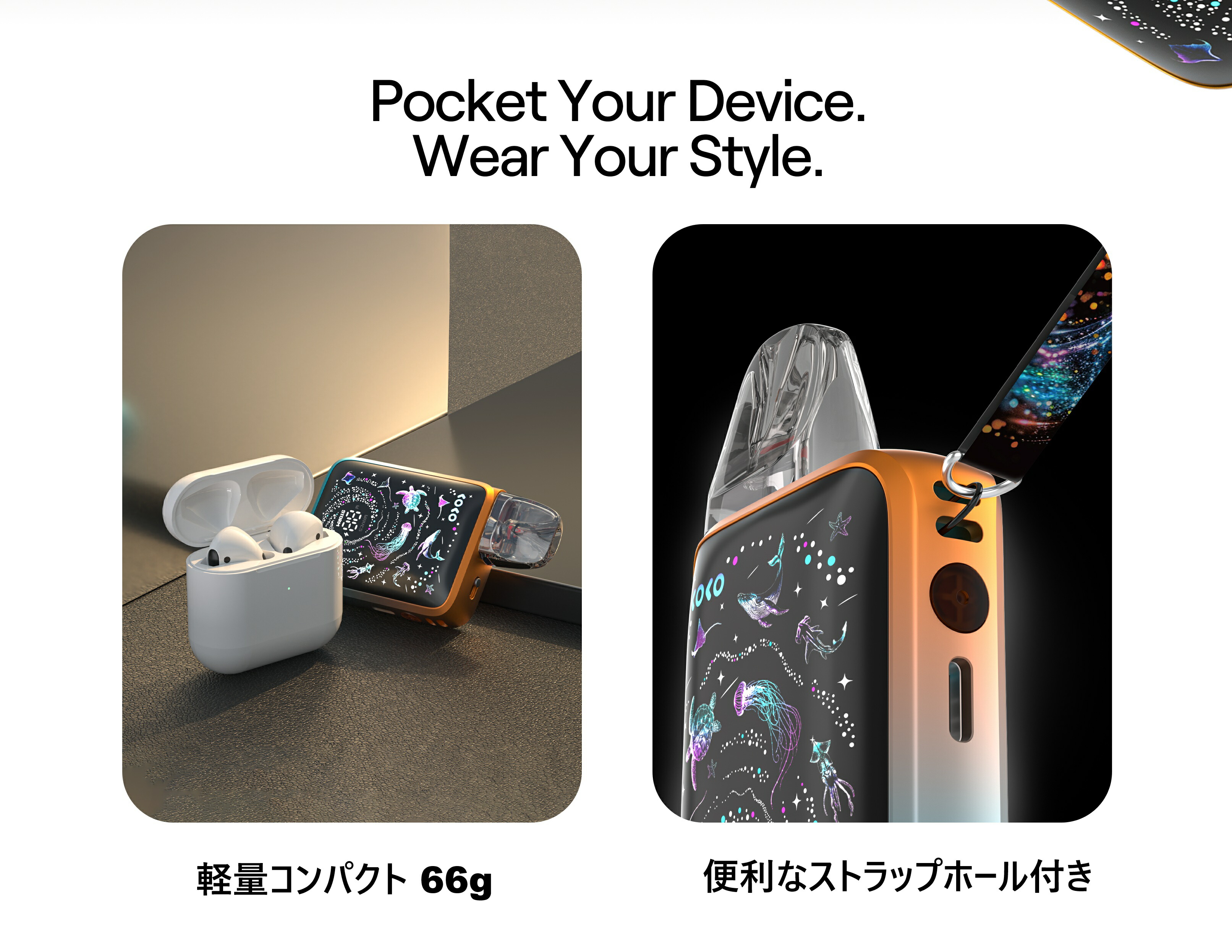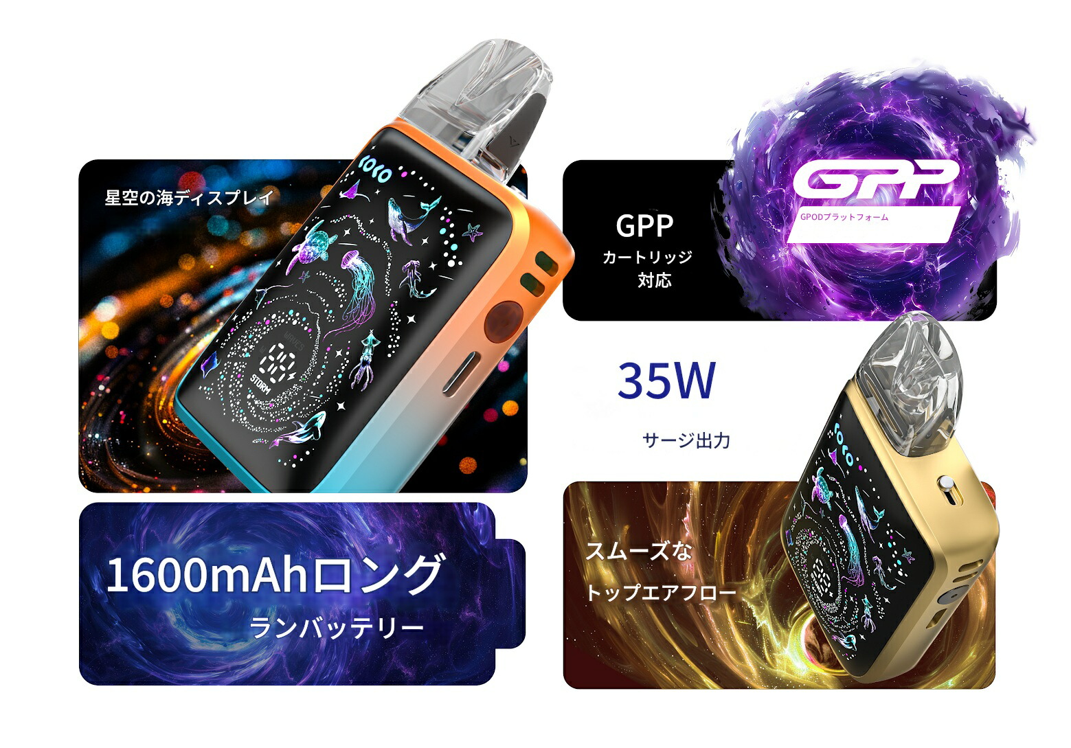 製品特徴 ・1600mAhの長寿命バッテリー。最大6日間使用可能 ・Type-C 5V/2A 急速充電 (ケーブル別売り) ・0-99% バッテリーインジケーター ・トップエアフロー、スライドスイッチでエアー調整可能 ・ストラップホール採用 (ストラップ別売り) ・すべてワンボタンで簡単なコントロール ・GPPカートリッジ互換 (G3カートリッジも使用可能) ・吸うだけ簡単、オートドロー ・PRO-FOCS 4.0強化フレーバー ・レザー調仕上げでグリップ感アップ ・2タイプの出力モード