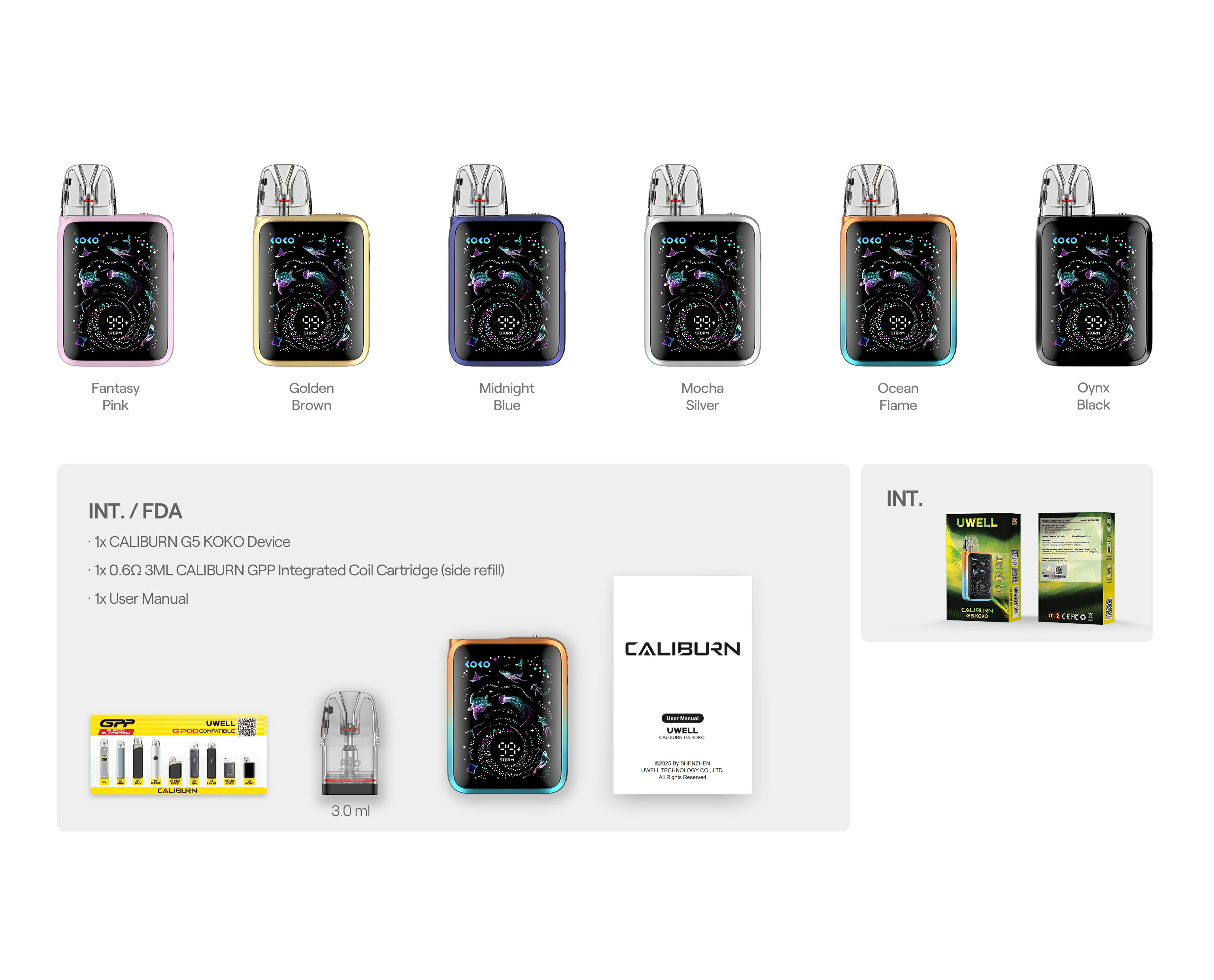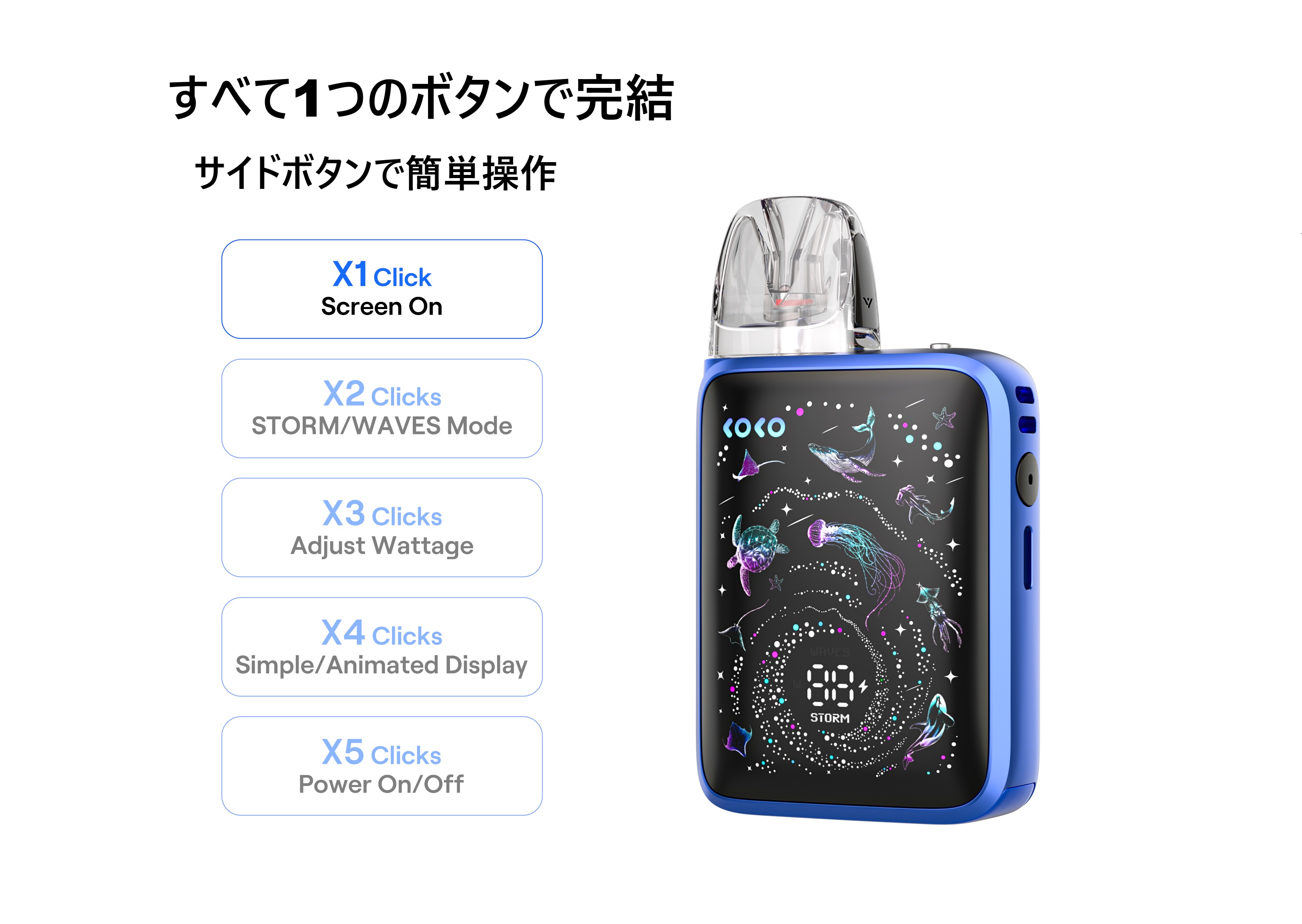 製品仕様 サイズ:84.8 * 49.1 * 21.8 mm 重さ:66g バッテリー容量:1600mAh 出力:最大35W ポッド容量:3ml ポッドタイプ:Caliburn GPPカートリッジ 充電:5V/2AType-C 急速充電 (ケーブル別売り)