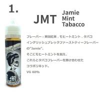 ●1.JMT(Jamie x Mint × Tabacco) フレーバー:英国紅茶 . モヒートミント . タバコ イングリッシュブレックファーストティーフレーバーの”Jamie”、そこにモヒートミントを加え、これらとタバコフレーバーを掛け合わせたコラボリキッド。 VG 60% 内容量:60ml