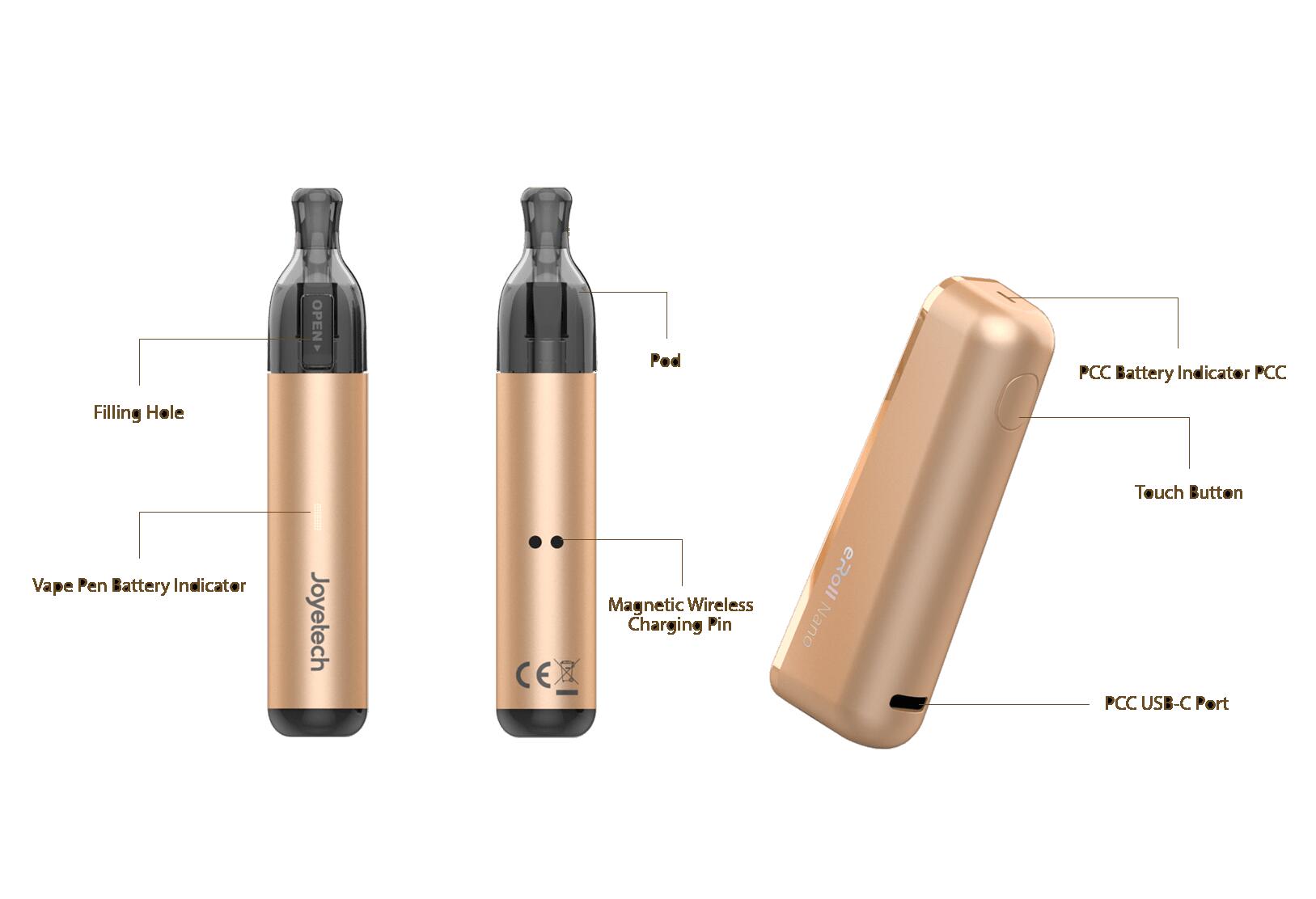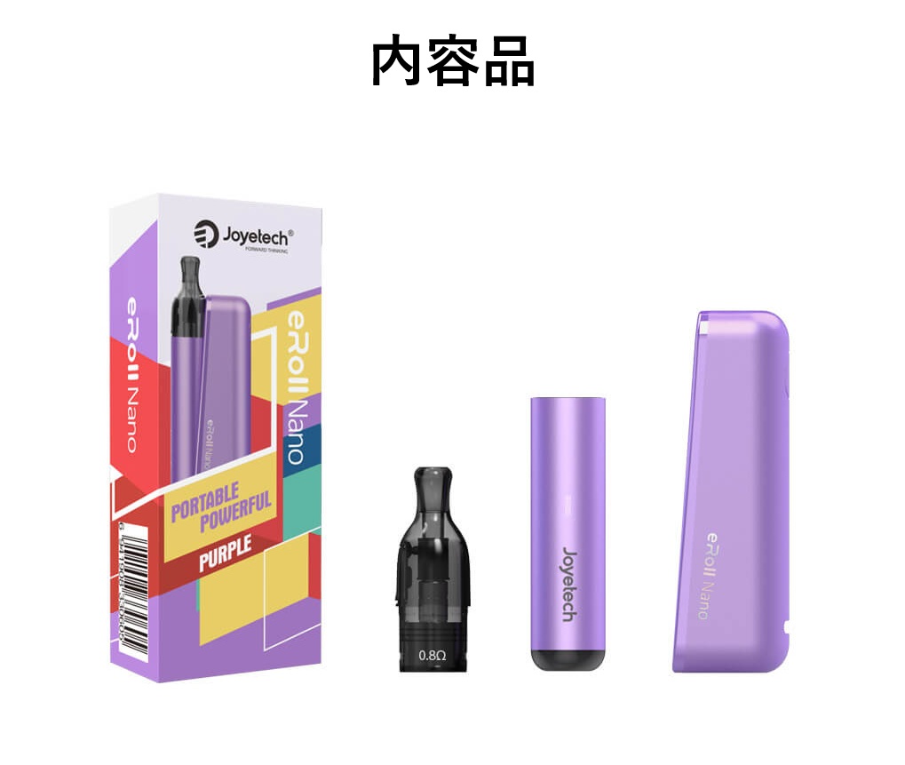 ■製品仕様 ・eRoll Nano Pen サイズ:φ17.5*96.1mm カートリッジ容量:2ml バッテリー容量:310mAh リキッド充填穴:3.3*4.5mm 充電電流:磁気ワイヤレス 充電 (5V/0.7A) 対応カートリッジ:Joyetech eRoll Nano Pod 0.8Ω/1.0Ω