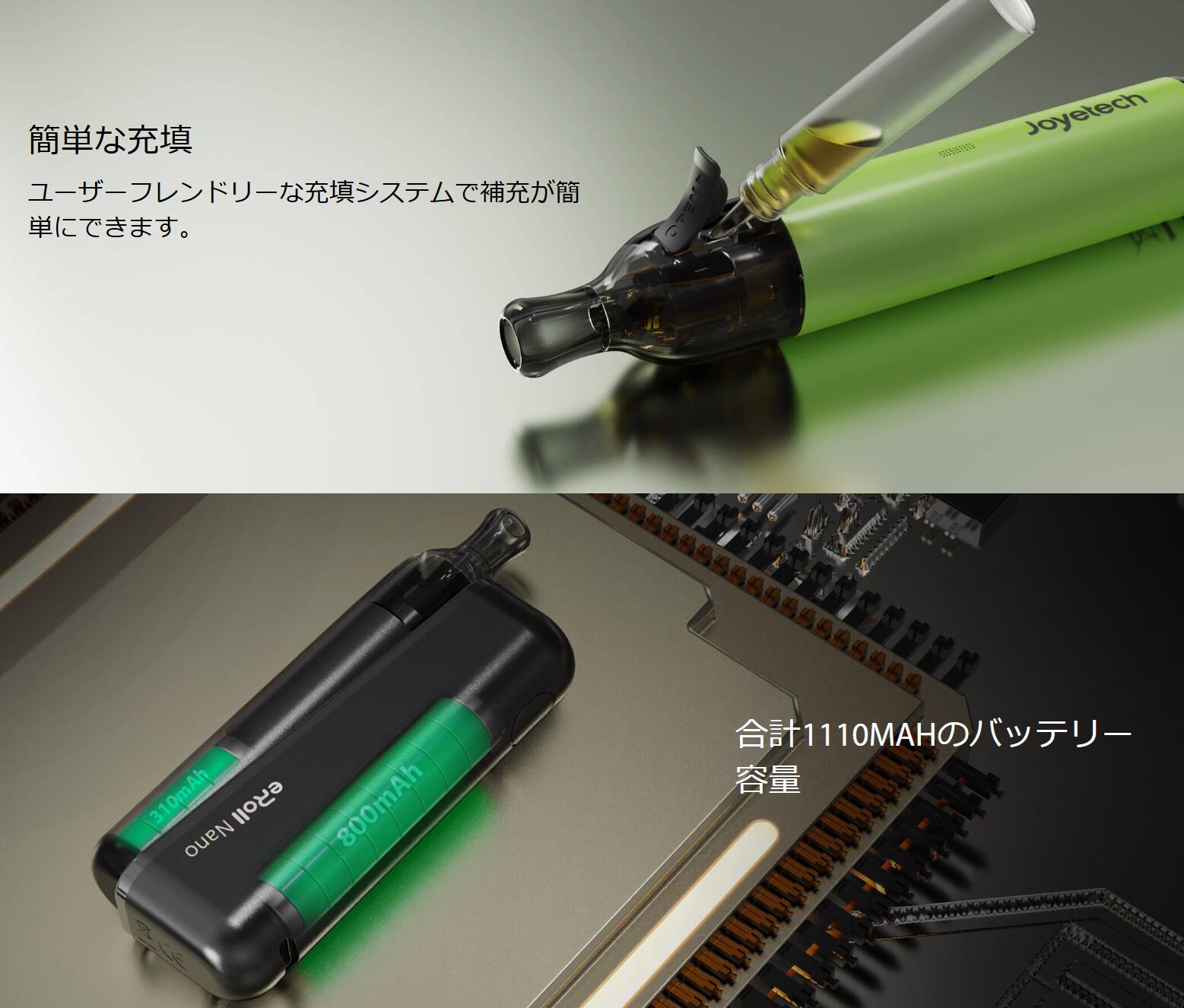 eRoll Nanoには、310mAhの内蔵バッテリー(Vape Pen)と 800mAhのバッテリー(PCC)で構成される 合計1110mAhのバッテリー容量が付属しています。 アークペンは単独で使用することも、 PCCと一緒に使用することも可能です。 eRoll Nanoキットは、 2mlのリキッド容量を持つカートリッジを備えており、 いつでもリキッドの状態と液面を監視することができます。