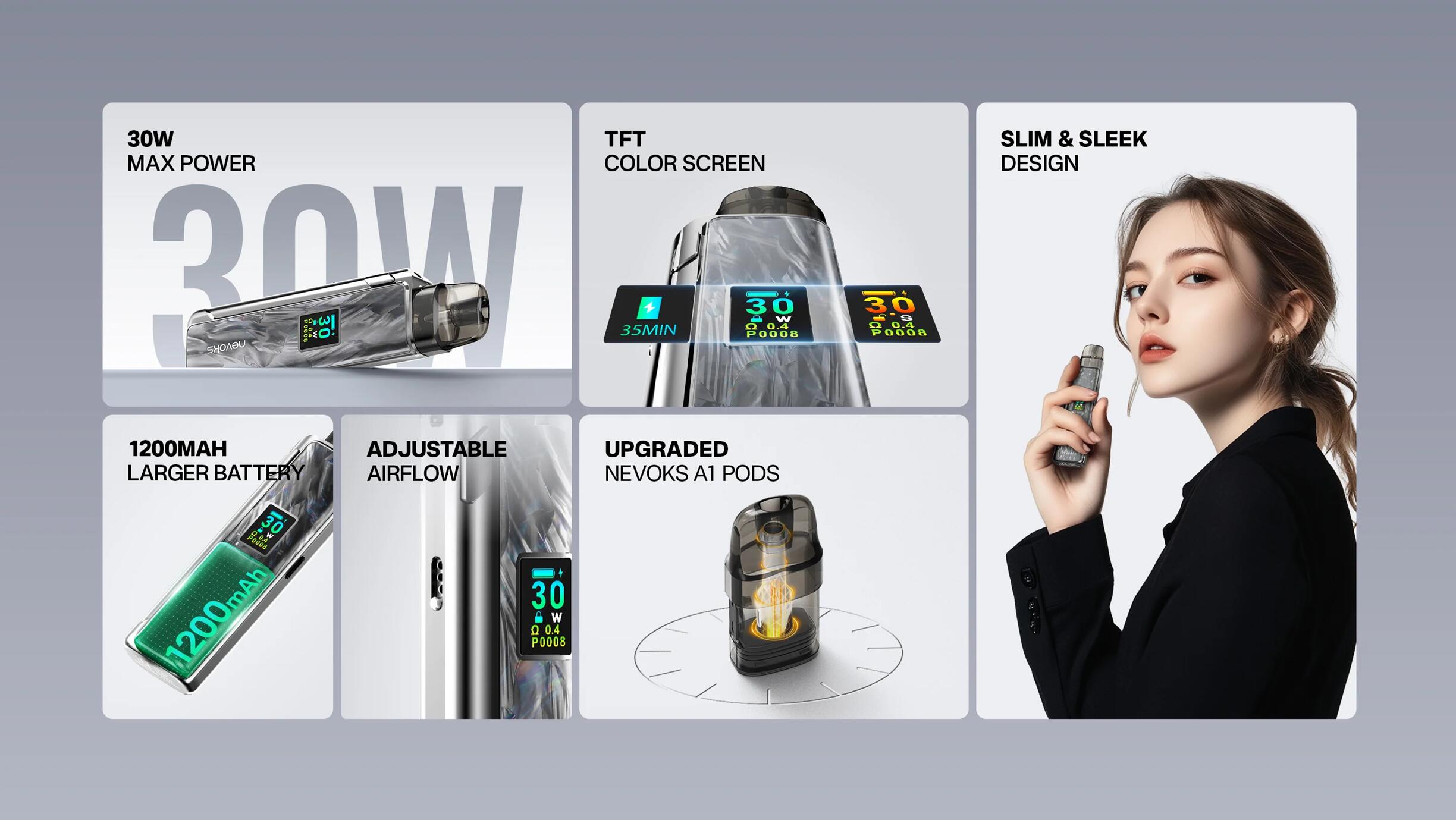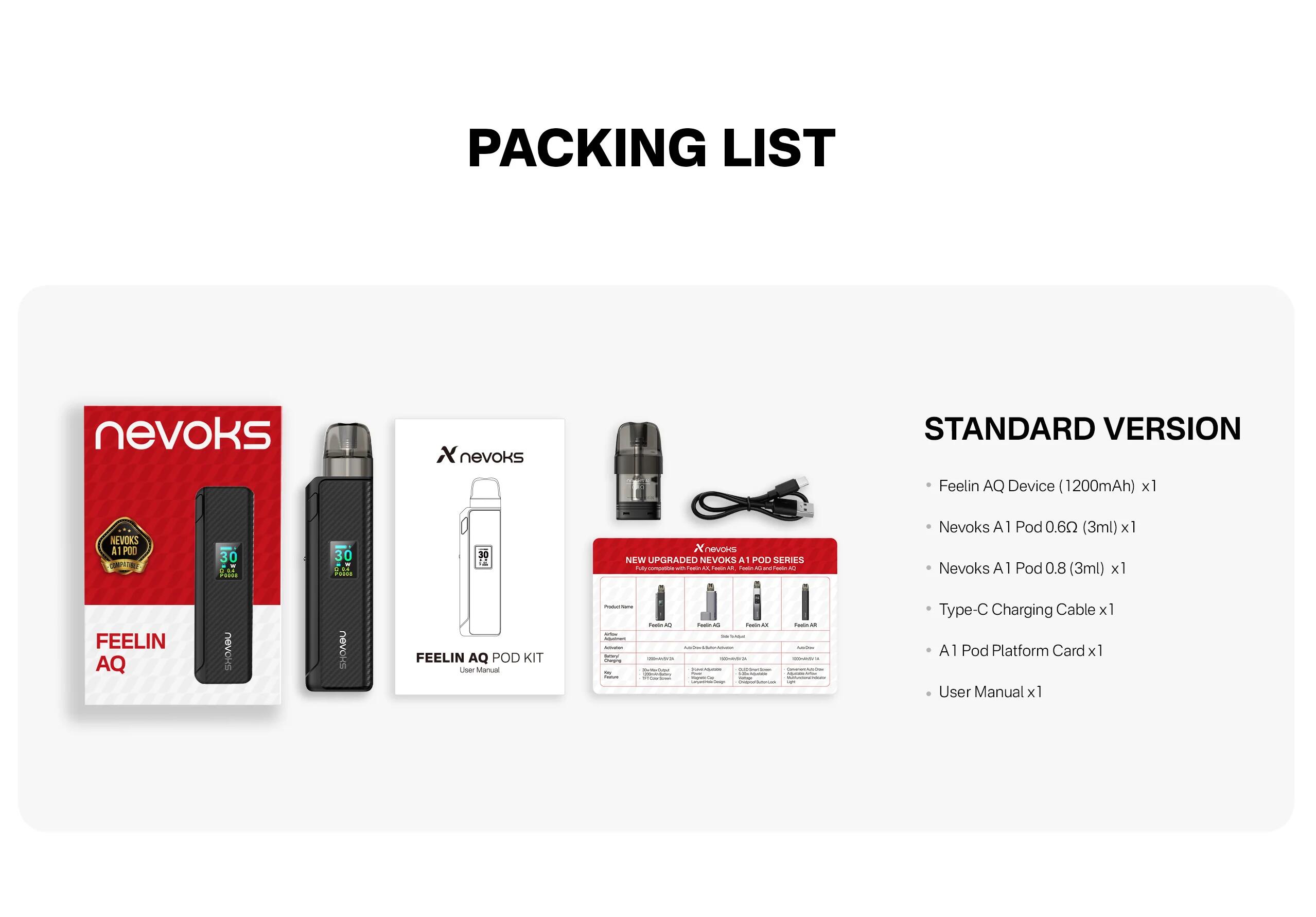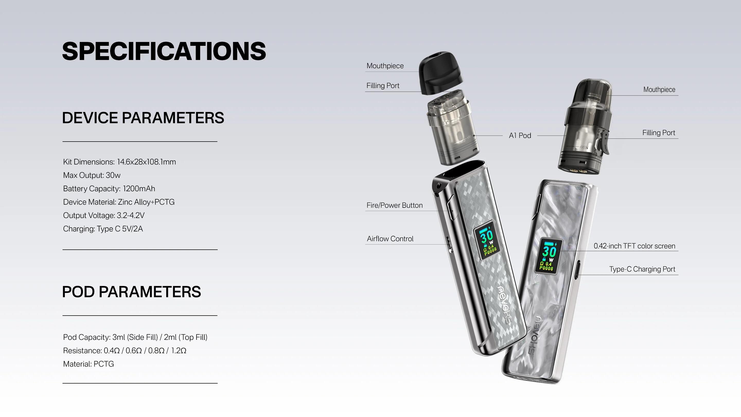 仕様: バッテリー容量: 1200mAh サイズ: 108.1 x 28 x 14.6mm 材質:亜鉛合金+PCTG 出力: 5-30W ポッド容量: 3ml 対応カートリッジ: NEVOKS A1 Pod 0.4/0.6/0.8/1.2Ω 充電: Type-C 5V/2A