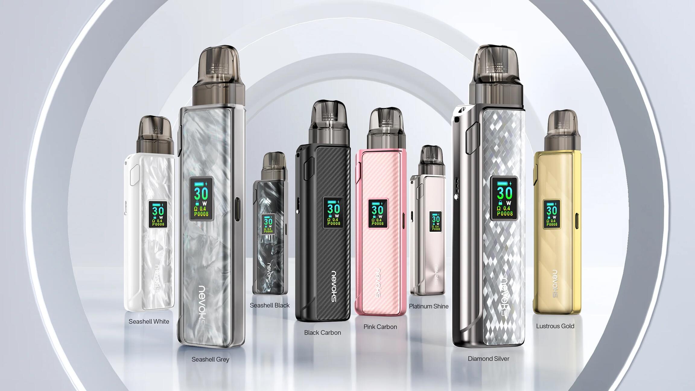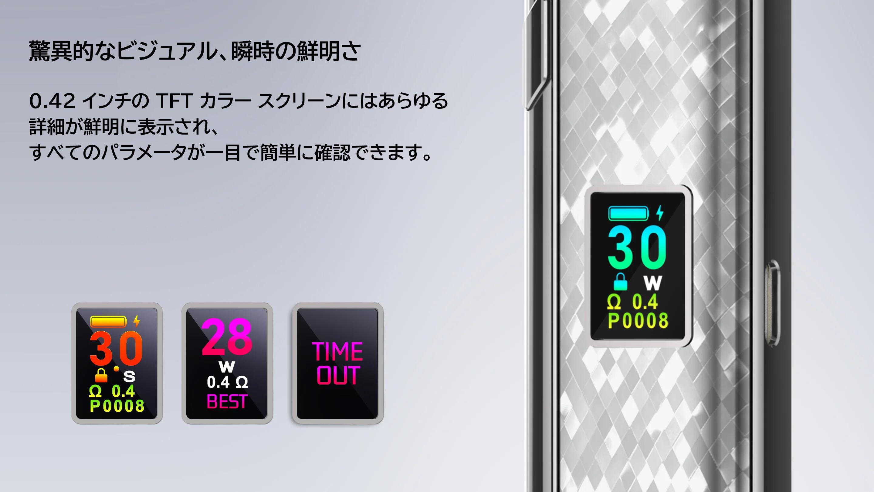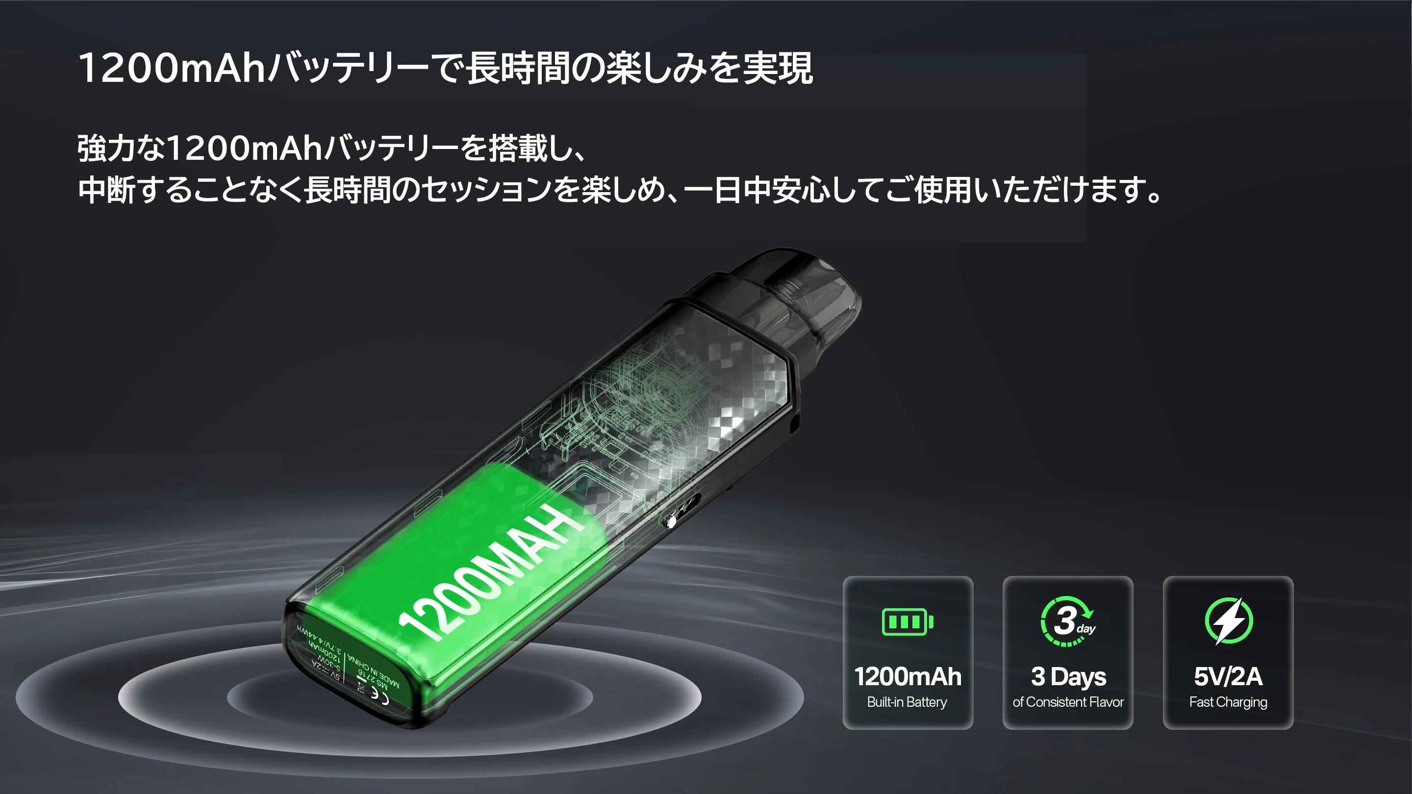 仕様: バッテリー容量: 1200mAh サイズ: 108.1 x 28 x 14.6mm 材質:亜鉛合金+PCTG 出力: 5-30W ポッド容量: 3ml 対応カートリッジ: NEVOKS A1 Pod 0.4/0.6/0.8/1.2Ω 充電: Type-C 5V/2A