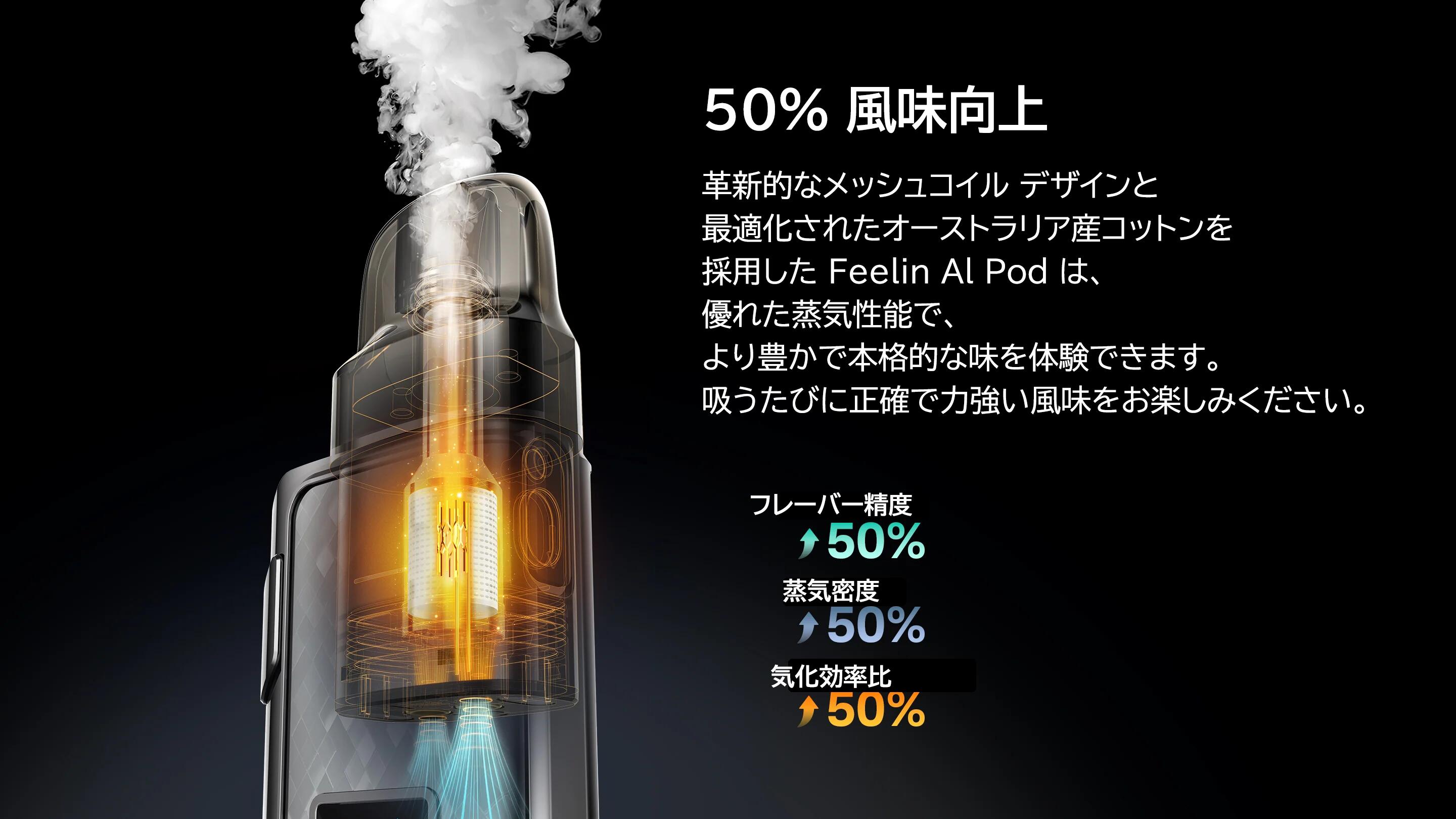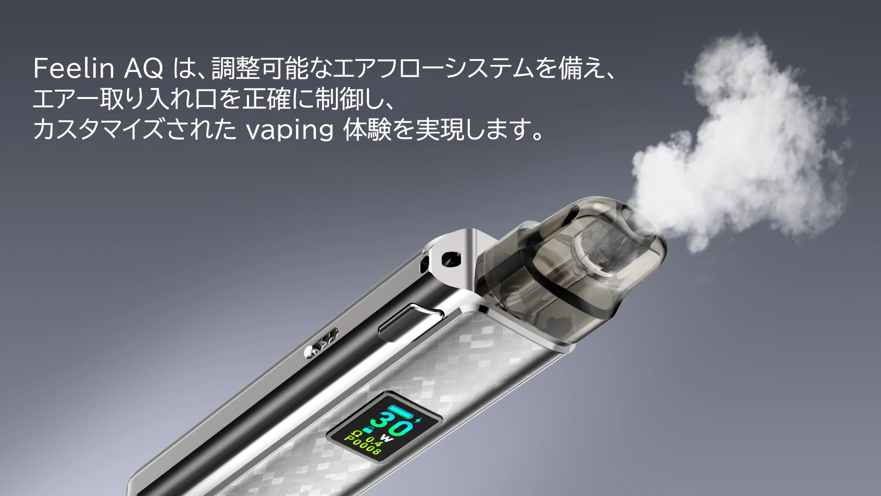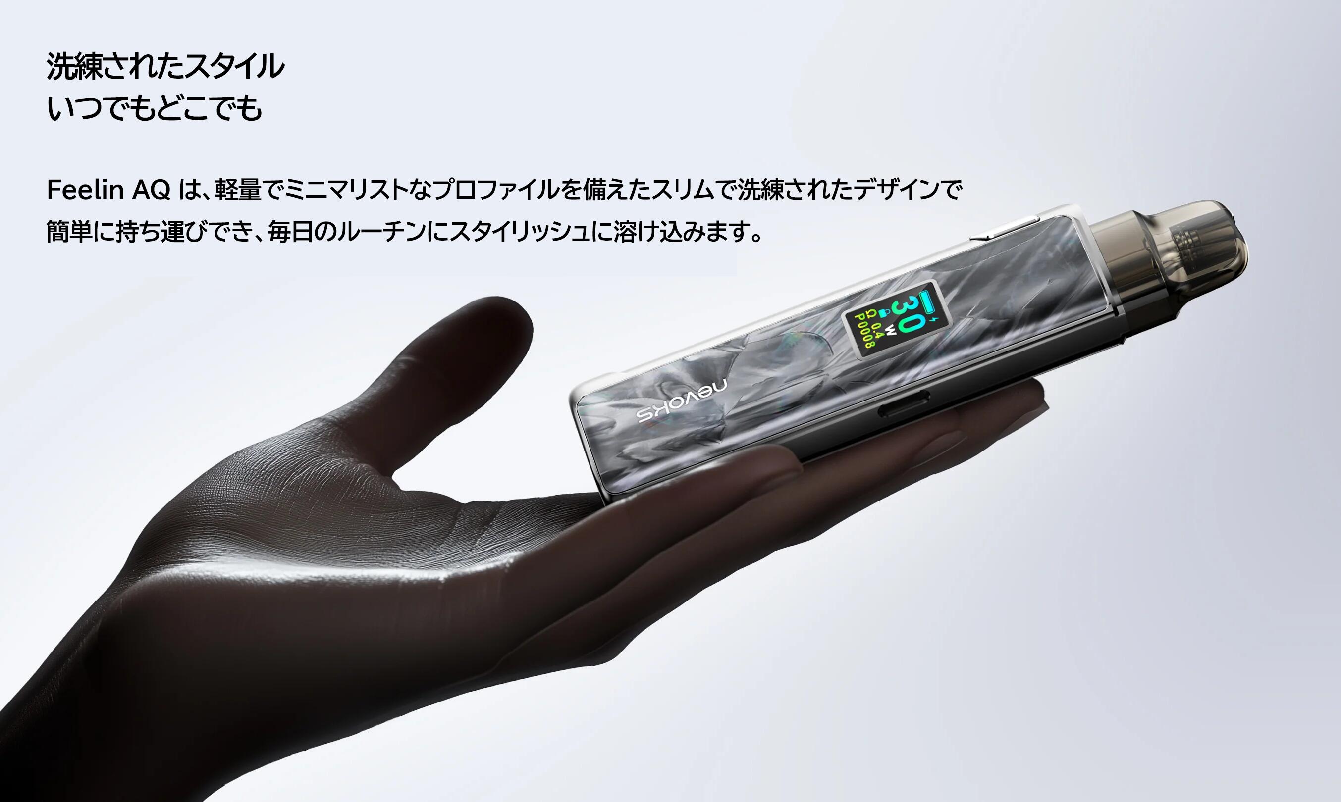 Nevoks Feelin AQ kitは、ベイピング体験を向上させるために設計された、 洗練されたコンパクトなポッドシステムキットです。 最大出力は30Wで、調整可能。 一貫したパフォーマンスを実現します。 1200mAhのバッテリーが内蔵されており、 頻繁に充電しなくても長時間使用できます。 鮮やかなカラーディスプレイは 簡単なナビゲーションを提供し、 デバイスにダイナミックな外観を追加します。 Feelin AQは、アップグレードされたA1ポッドが使用されております。 エアー調整はサイドスライドスイッチでいつでも簡単に可能です。