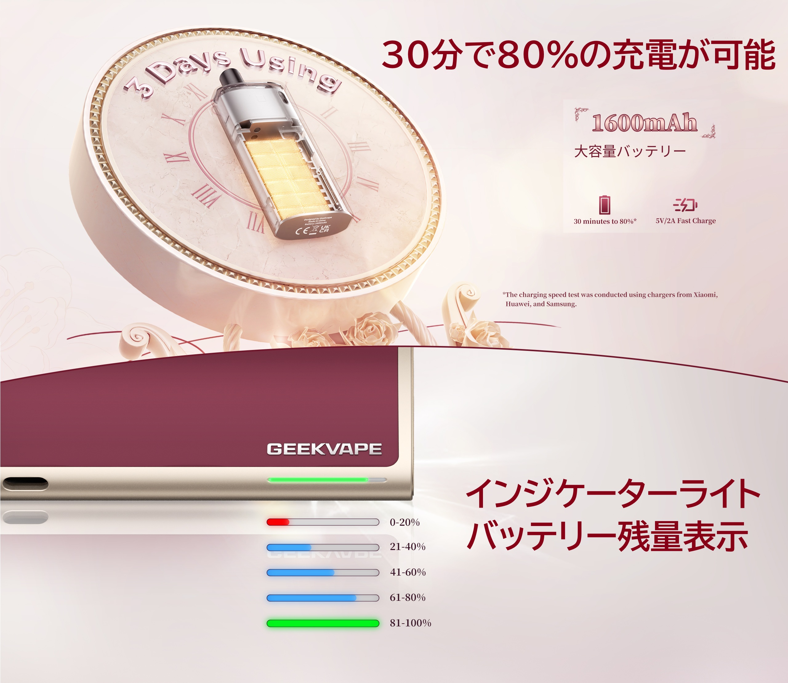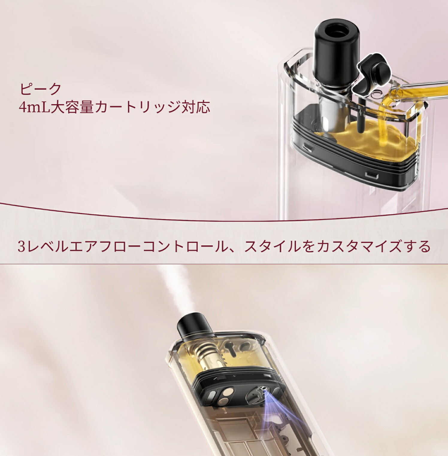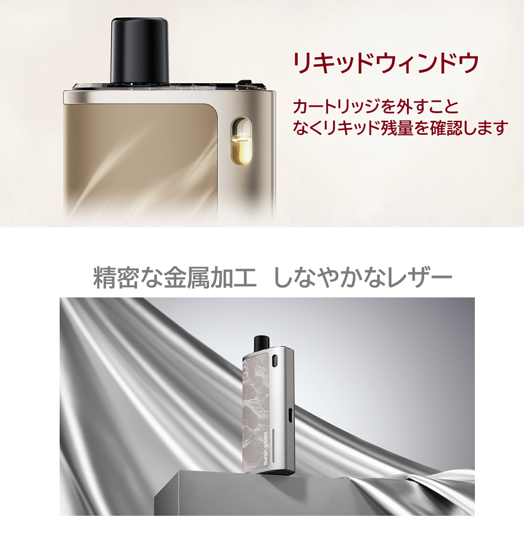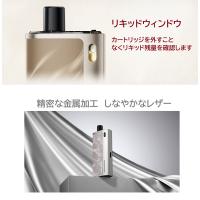 製品特徴 ・内蔵1600mAhバッテリー ・大容量4mlカートリッジ ・携帯性の高いコンパクトサイズ ・3段階調整可能なエアフロー ・ボタン操作不要の直感的な自動吸引起動 ・プレミアムレザーと亜鉛合金製 ・Type-C 高速充電対応 ・トップフィル設計で液漏れ防止 ・LEDバッテリーインジケーター