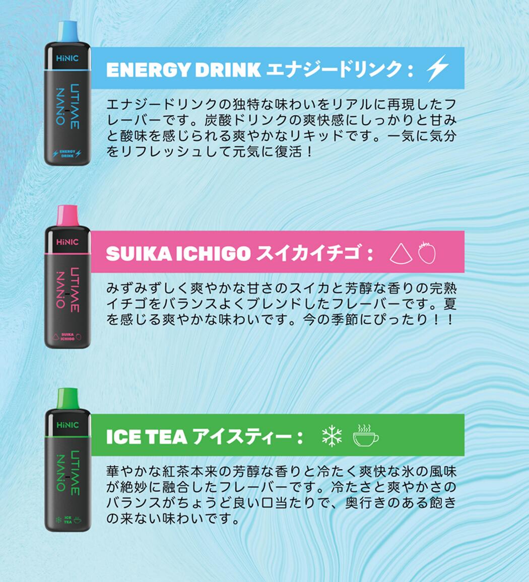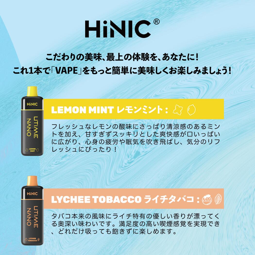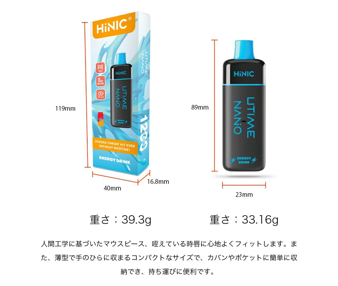 HiNIC Utime Nanoはリアルな風味を味わえるだけでなく、満足度の高い喫煙感覚も実現でき、吸い心地を徹底追求した極上の使い捨てVAPEです。 ・1200回吸引可能(ご使用状況により異なります)・メンテナンス不要・リキッド注入不要・充電不要サイズ:89×23mm重さ:33g