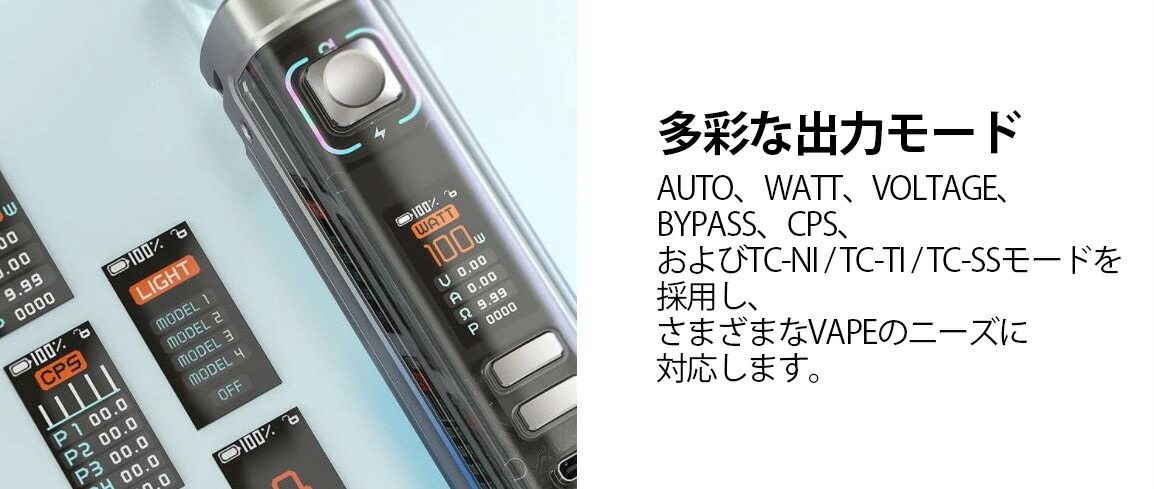 ■超大容量!内蔵3200mAhバッテリー搭載 ■最大100W出力 ■6種類の出力モード選択可能 ■BPコイル互換 ■PODを回転させエアー量を調整 ■広々とした0.96インチTFTカラースクリーン ■ねじ込み式トップフィルで漏れ防止、簡単リキチャチャージ