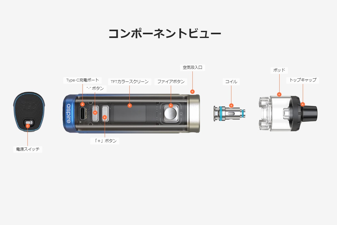 サイズ:129.6×34×28mm 重量:164g バッテリー容量:3200mAh Pod容量:5ml 出力:1-100W 調整可能 モード:Auto/Watt/Voltage/Bypass/TC/CPS 充電:Type-C 5V/2A 対応コイル:Aspire BPコイル