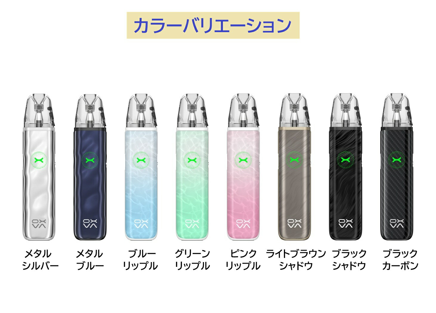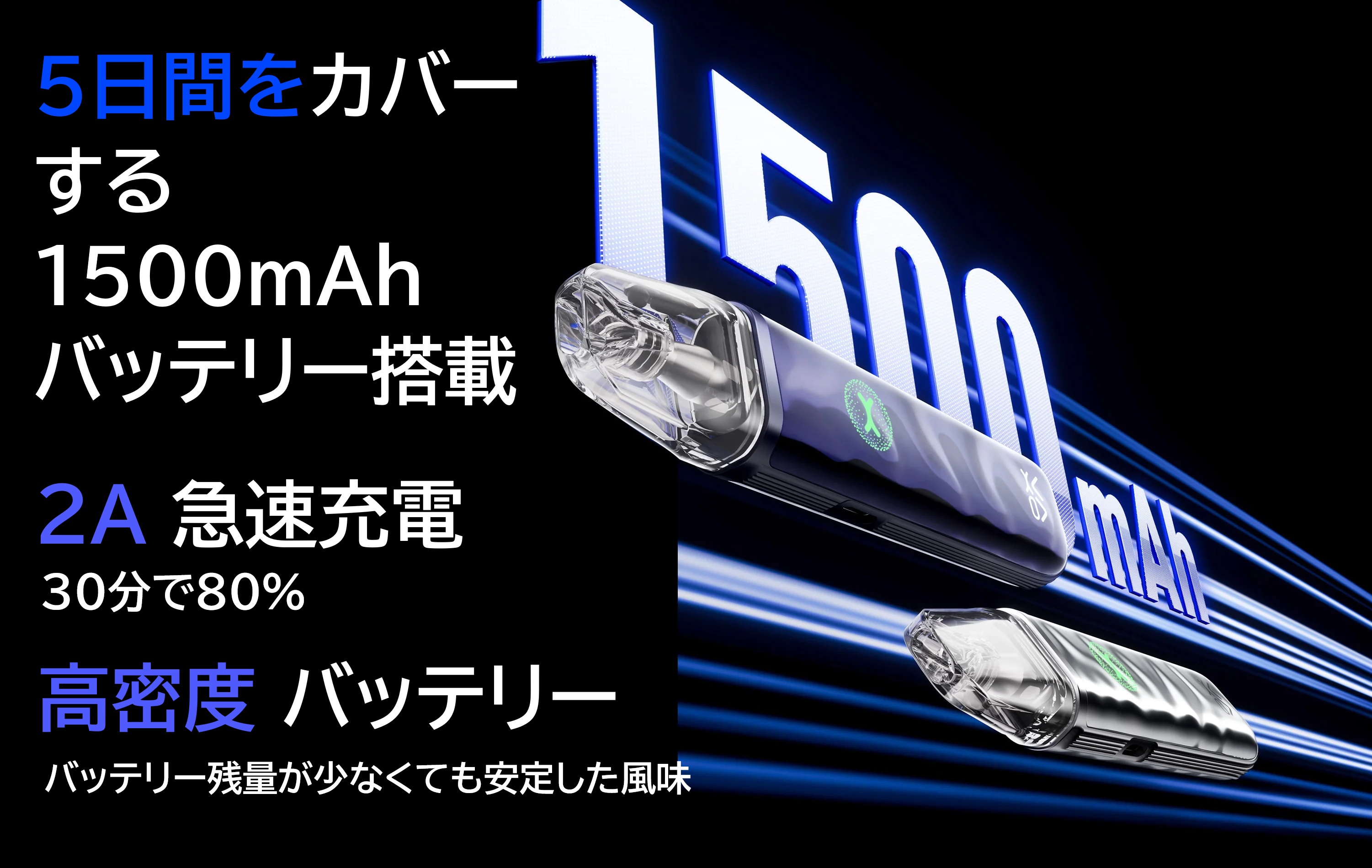 ■製品仕様 サイズ:26.4x15x117.4mm 重さ:45.9g バッテリー容量:1500mAh 出力:5-30W 充電:5V/2A、Type-C (ケーブル別売り) エアフロー:サイドAFC 材質:PCTG+IML 対応カートリッジ:XLIM シリーズPOD 0.4/0.6/0.8/1.2Ω