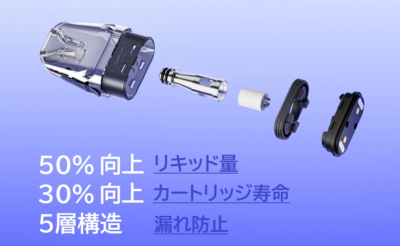 ・カートリッジは前XLIMカートリッジから 容量が2MLから3MLにアップ。 さらにカートリッジ寿命も30%向上 5層構造による液漏れ防止対策。