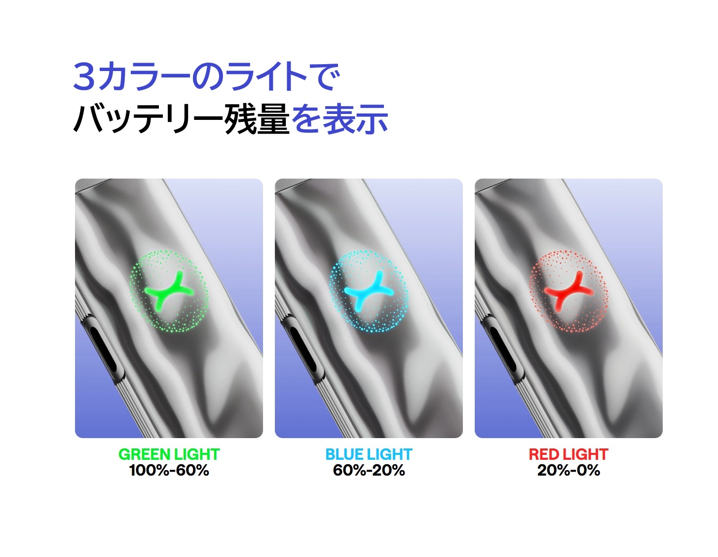 ・バッテリー残量を3カラーで表示する バッテリーインジケーター。