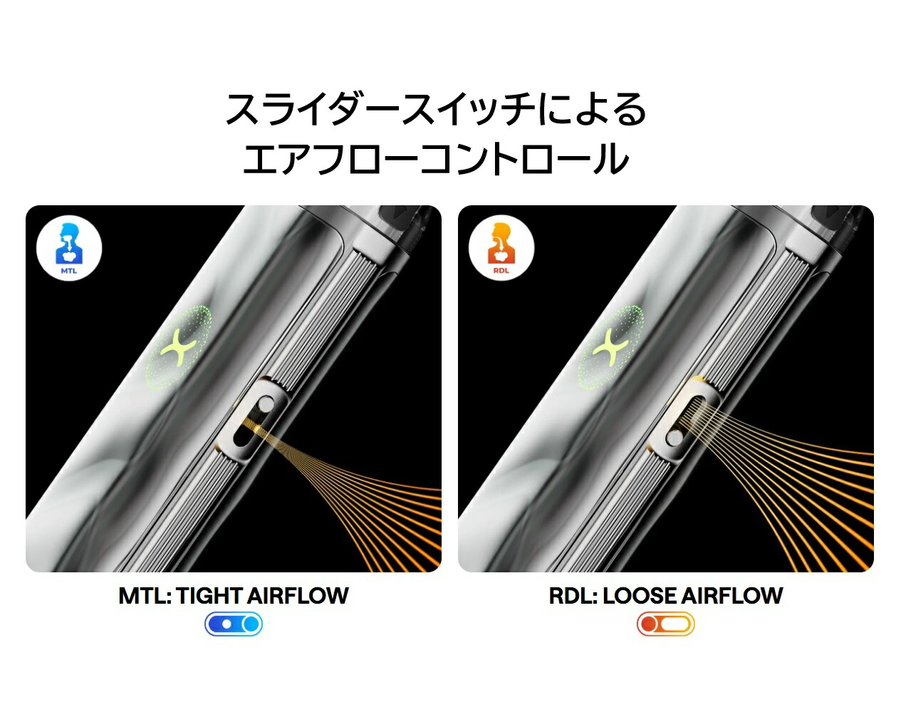 ・サイドのスライダースイッチで エアフロー調整可能。