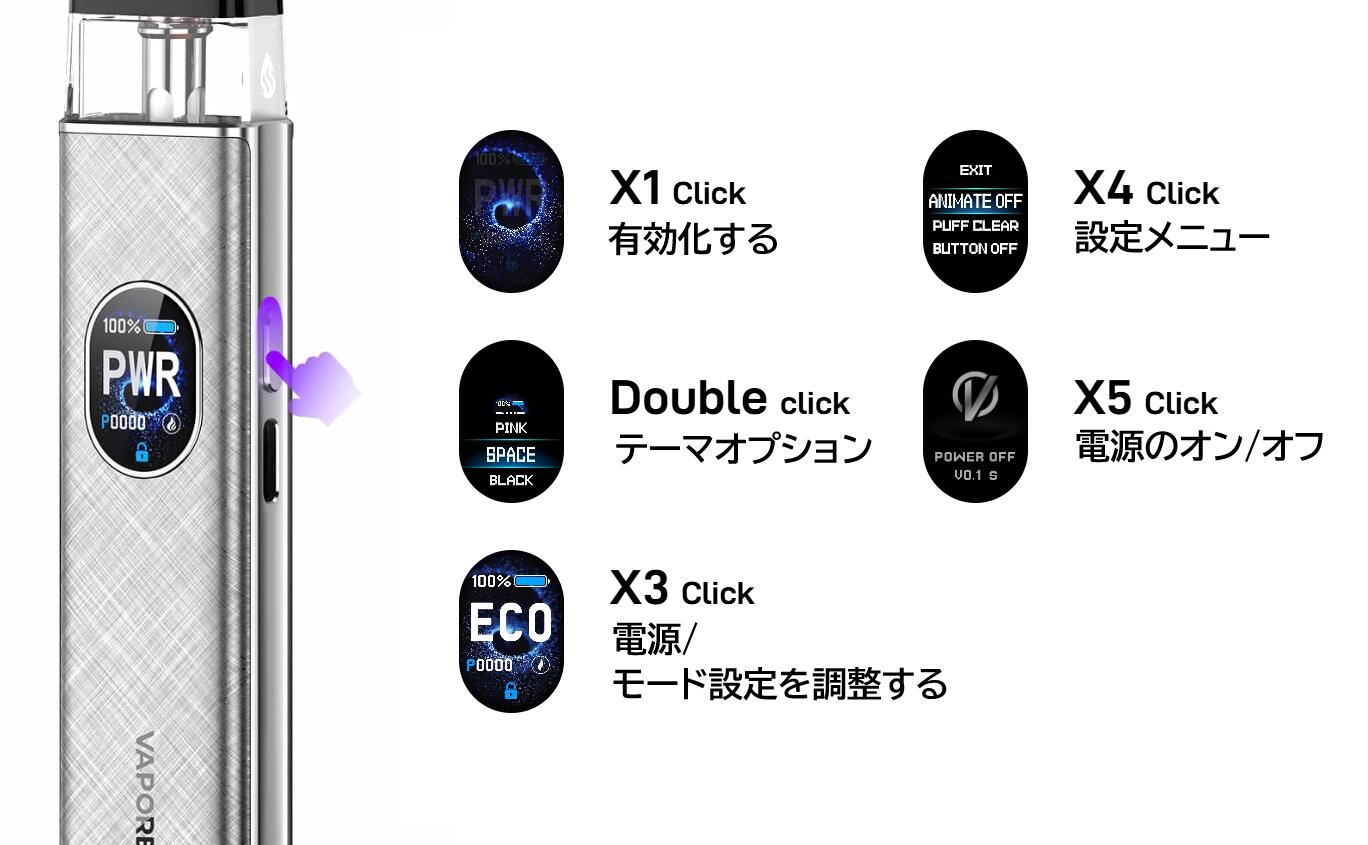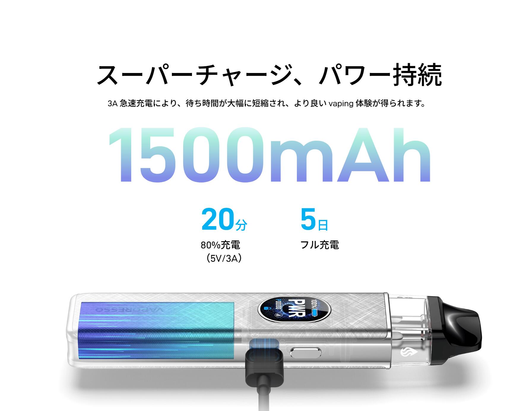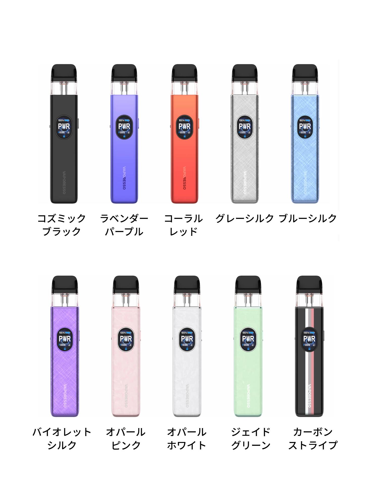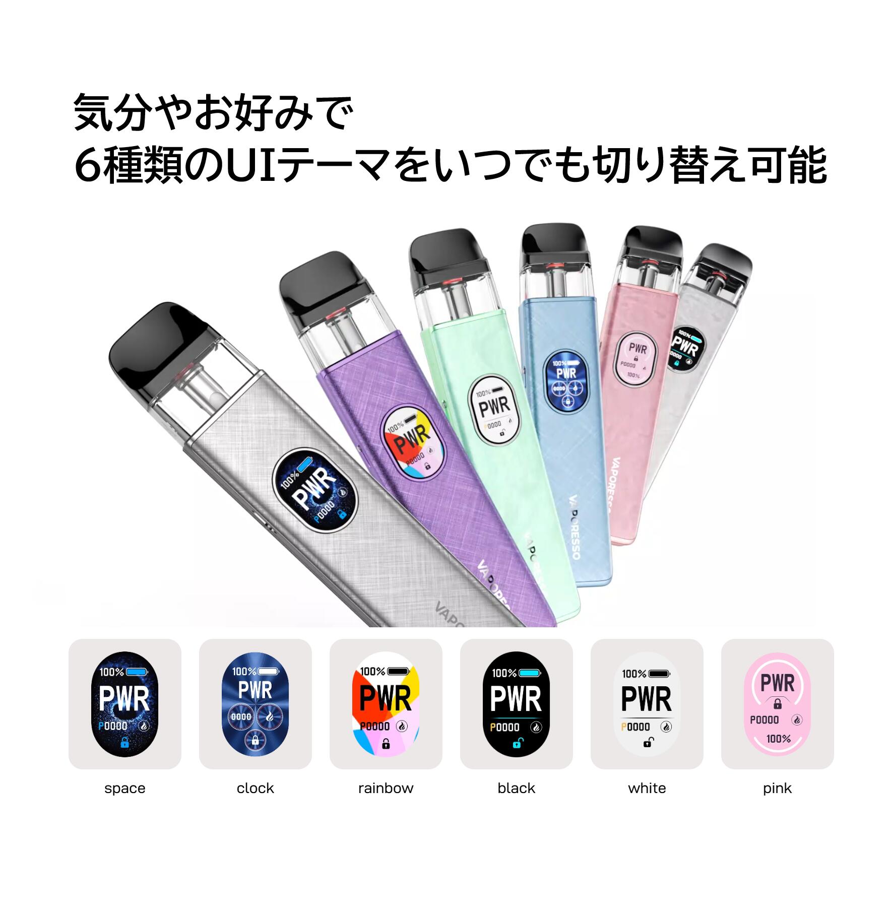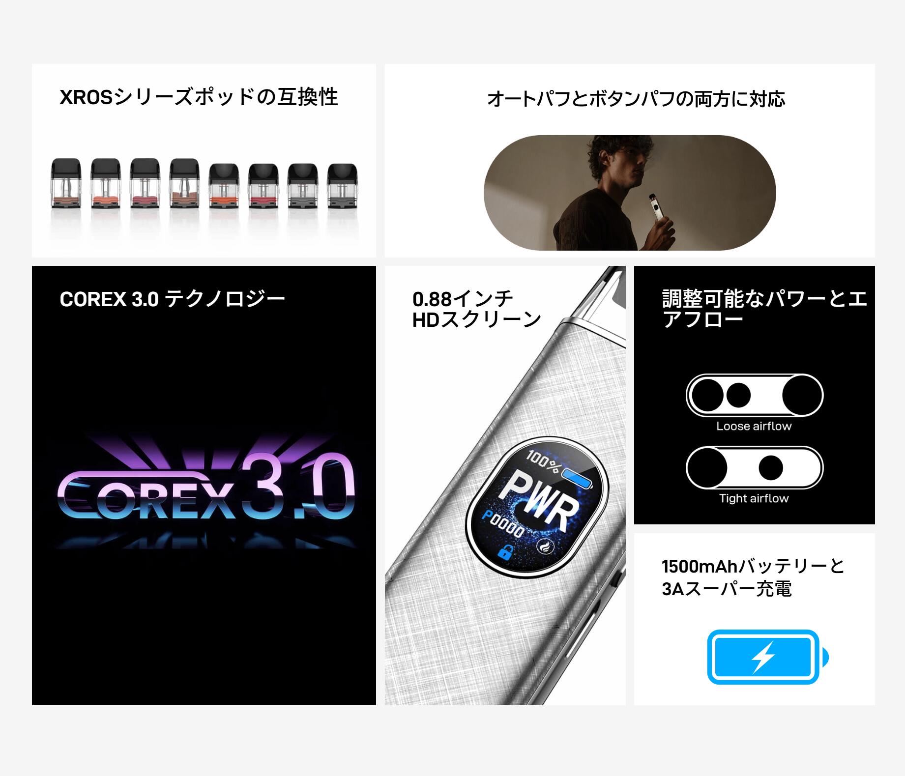 ・COREX 3.0 テクノロジー SSS漏れ防止技術 ・オートパフとボタンパフの両方に対応 ・1500mAhバッテリー&3Aスーパーチャージング ・0.88インチHDスクリーン ・調整可能なパワーとエアフロー ・XROSシリーズ ポッドの互換性