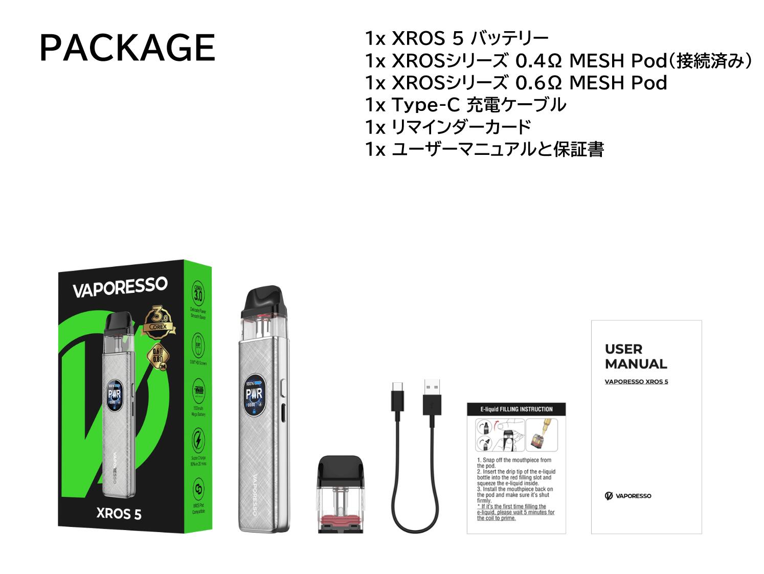 仕様 サイズ:120.8×24.5×14.5mm 重量:73.7g POD容量:3ml バッテリー容量:1500mAh 出力調整:3段階 最大出力:30W 充電:Type-C 5V/3A 対応カートリッジ:XROSシリーズ Pod 0.4Ω/0.6Ω/0.8Ω/1.0Ω/1.2Ω