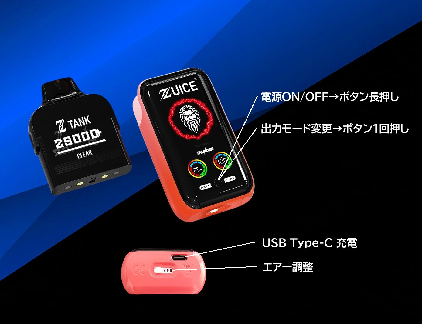 《製品仕様》 ・液漏れなし ・カートリッジが交換可能 ・ディアルメッシュコイルで濃厚フレーバー ・エアー調整可能 ・800mAh内蔵バッテリー ・USB Type-C 充電 2タイプの出力モードで変更可能 ・ノーマルモード25000パフ ・サンダーモード15000パフ ・バッテリー残量表示 ・対応カートリッジ:Z TANKカートリッジ 本体サイズ:102 x 50 x 28mm 重さ:102g リキッド容量:18ml