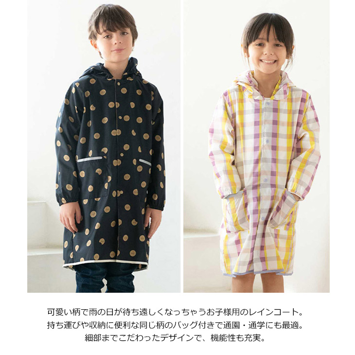 可愛い柄で雨の日が待ち遠しくなっちゃうお子様用のレインコート持ち運びや収納に便利な同じ柄のバッグ付きで通園・通学にも最適。前後4か所に反射が付いているので安心!名前が書けるネーム付なのもうれしいポイント。後ろのボタンを外すと、ランドセルを背負ったまま着用できます。