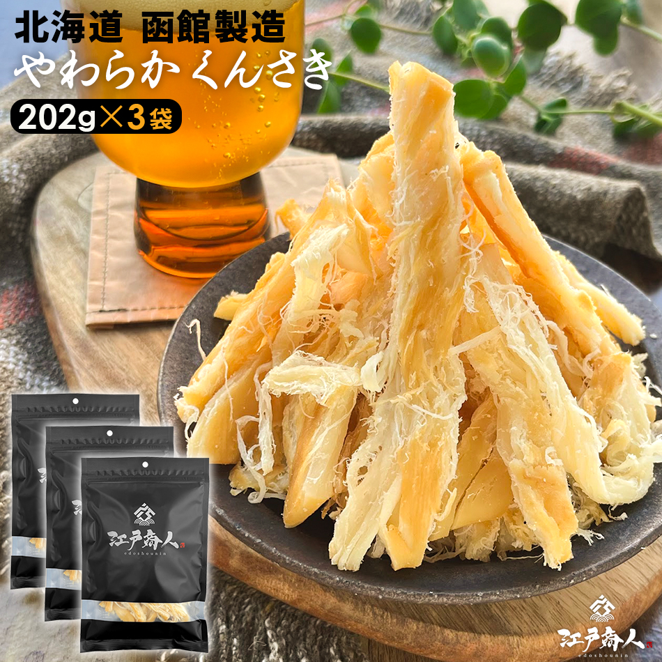 商品名:やわらかくんさき 202g×3袋 北海道 函館製造 さきいか 燻製 おつまみ 珍味 新生活 お取り寄せ 乾き物 江戸商人印