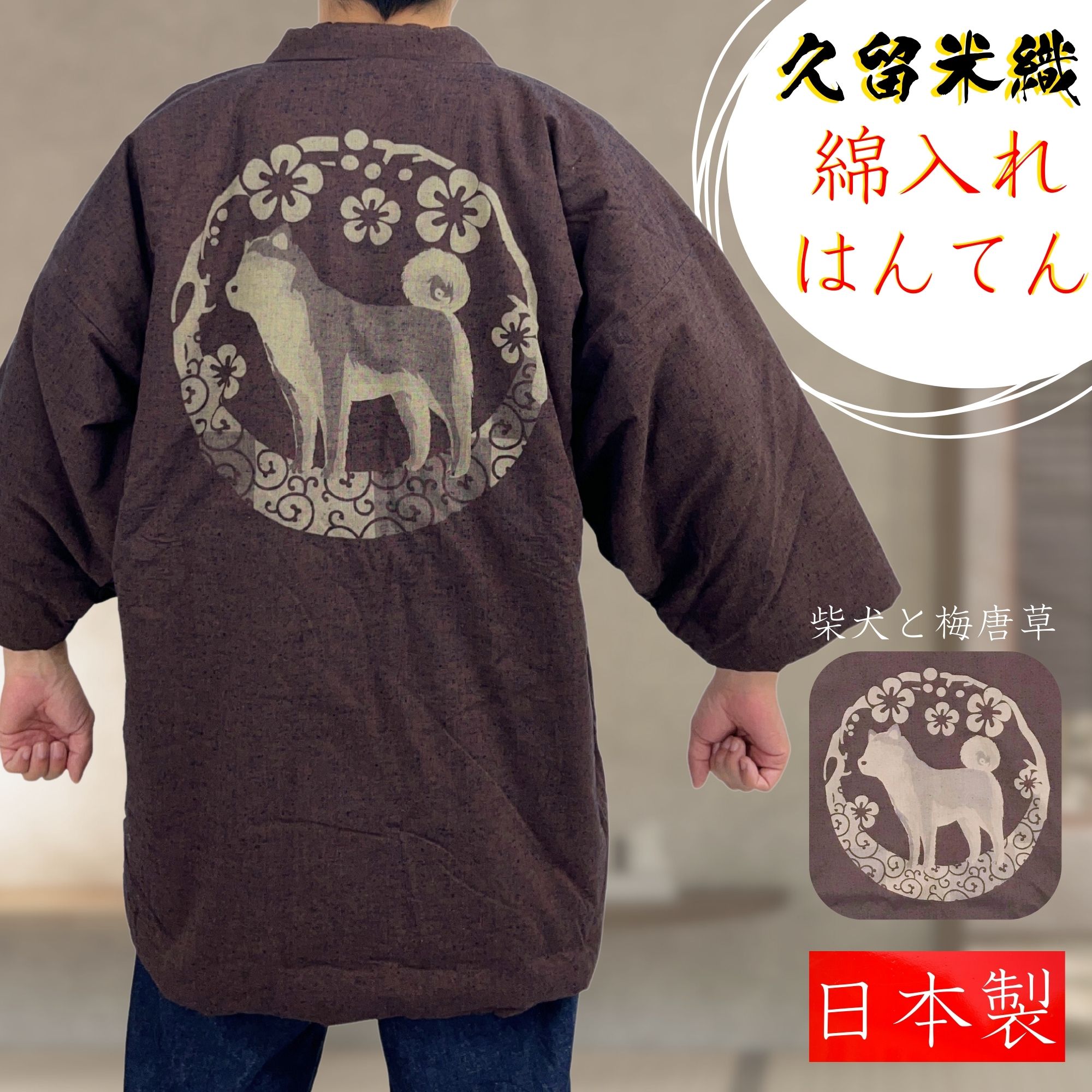 [江戸てん] 久留米半纏 日本製 久留米織 綿紬織 半纏 はんてん 綿入れ 中綿入り メンズ レディース 防寒 部屋着 冬用 抜染 柴犬と梅唐草 茶 フリー