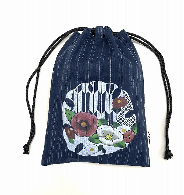 [江戸てん訳あり 信玄袋 合切袋 しじら織 捺染柄入り 綿100% 巾着 御朱印帳袋 椿 青ストライプ