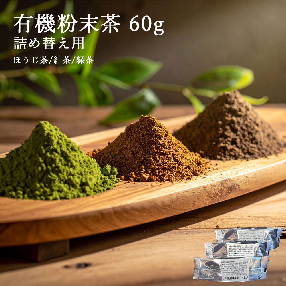 有機粉末茶 詰め替え 緑茶 紅茶 ほうじ茶 インスタント パウダー 粉末 水出し 有機栽培 3種類 60g