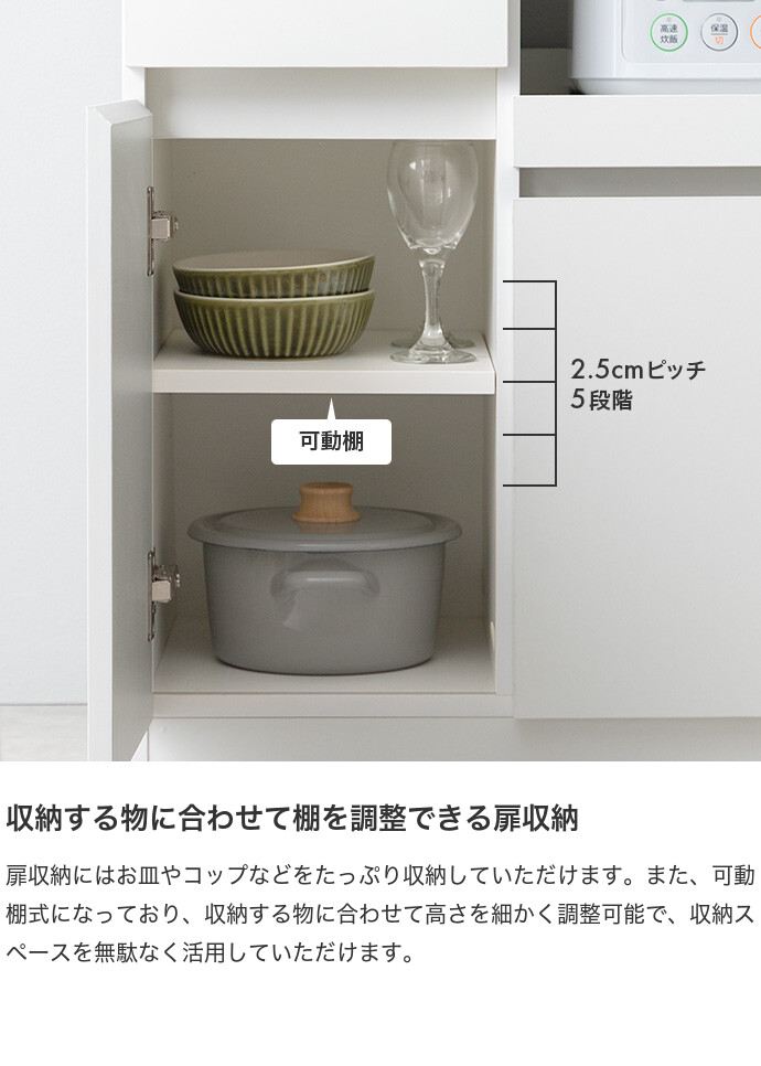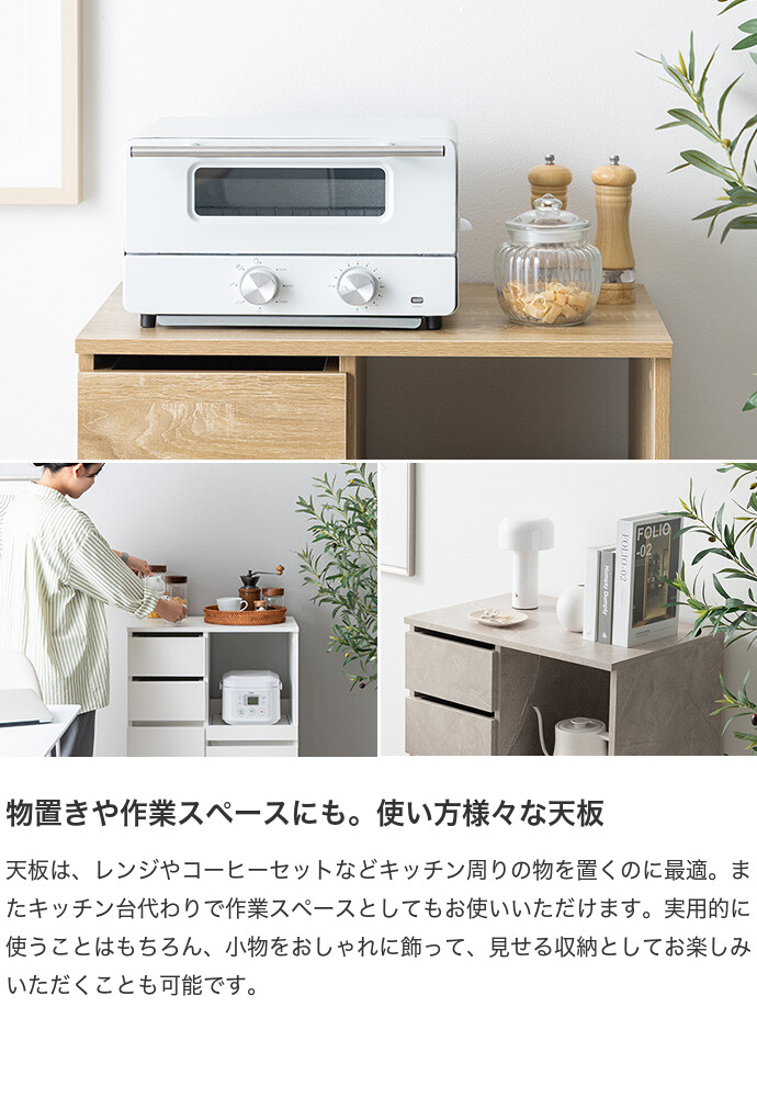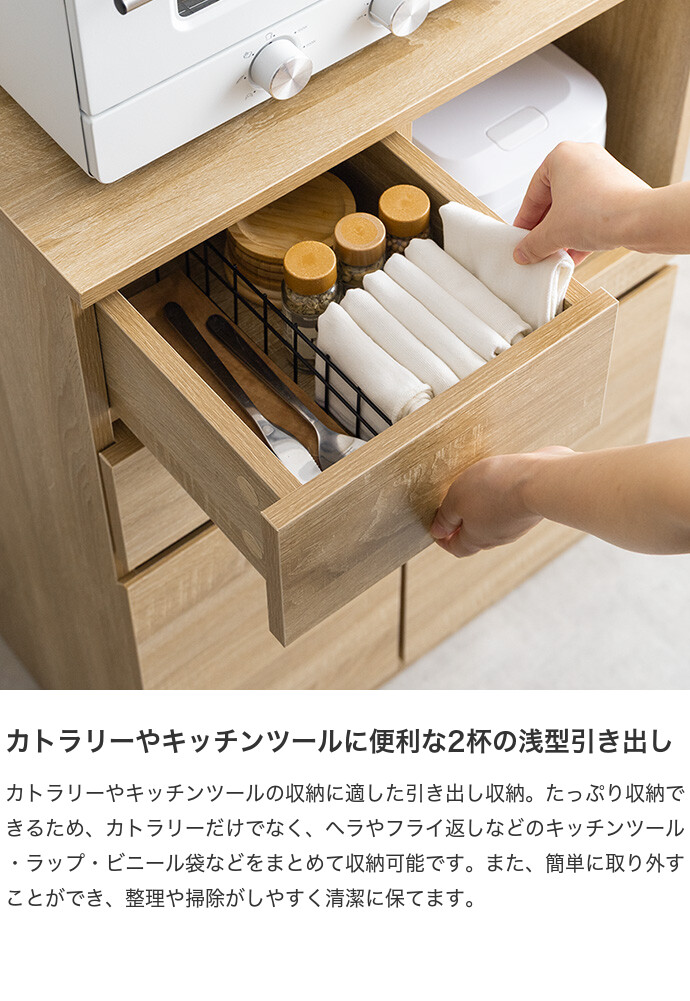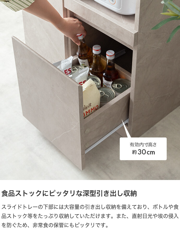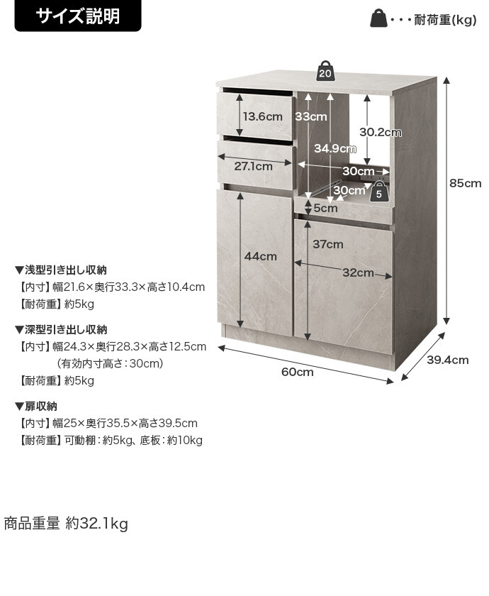 【耐荷重】天板:約20kg 、引き出し:(各)約5kg、スライドトレー:約5kg、可動棚:約5kg、扉収納内底板:約10kg