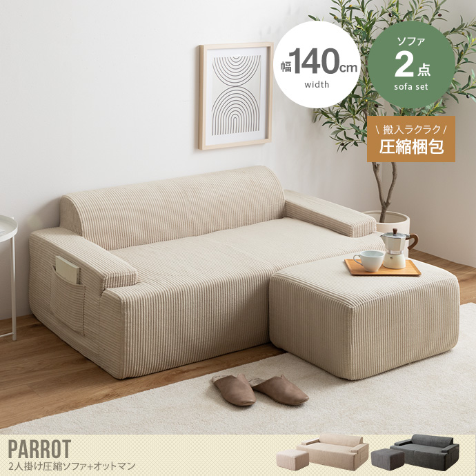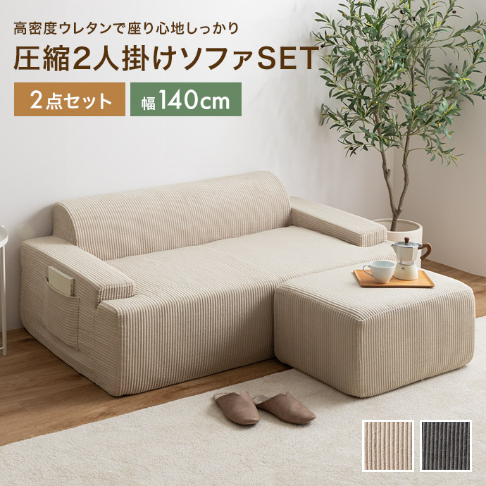 2人掛けソファセット 圧縮ソファ オットマンセット ソファ ソファー 二人 2P 圧縮梱包 圧縮 コーデュロイ生地 脚なし 滑り止め ゆったり 高密度 ローバック