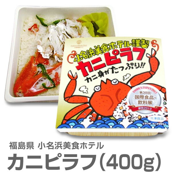 ●カニピラフはいわき市民にとって特別なご馳走なんです。いわき市民の味カニピラフ。今やいわき市の多くの料理店でも提供され、盆暮れ正月とめでたい日には絶対に欠かせない「いわきのグルメ」になっています。ここに紹介する小名浜美食ホテルさんの厨房手作りカニピラフは、カニピラフに特にこだわり、うるさいいわき市民も大好物の一品。浜田屋が自信を持って全国に発送致します。