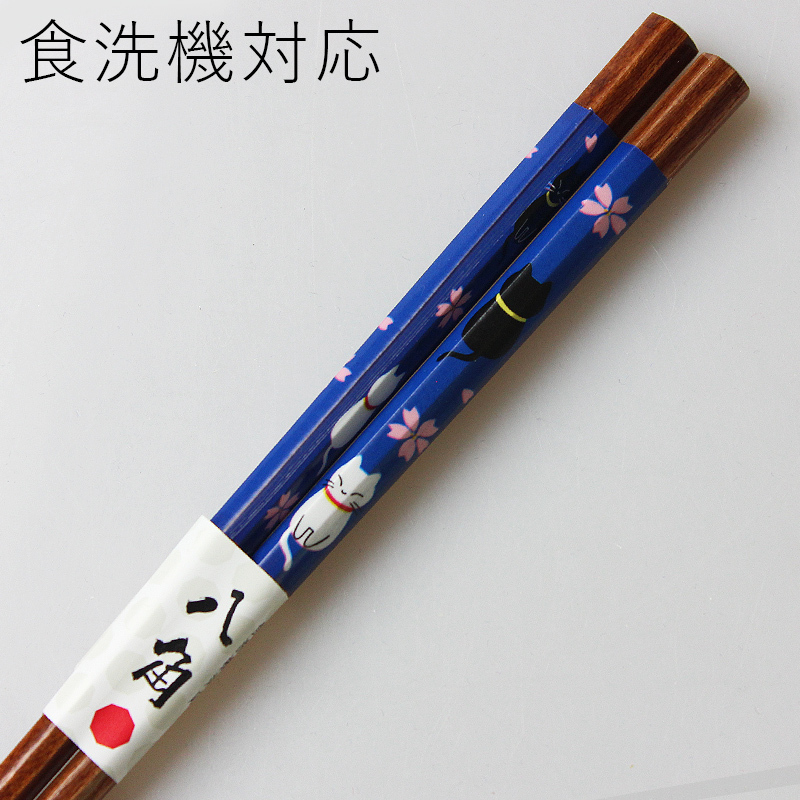 郵送で送料無料 食洗機対応 お箸 八角 猫と桜 青 22.5cm 国産 若狭塗
