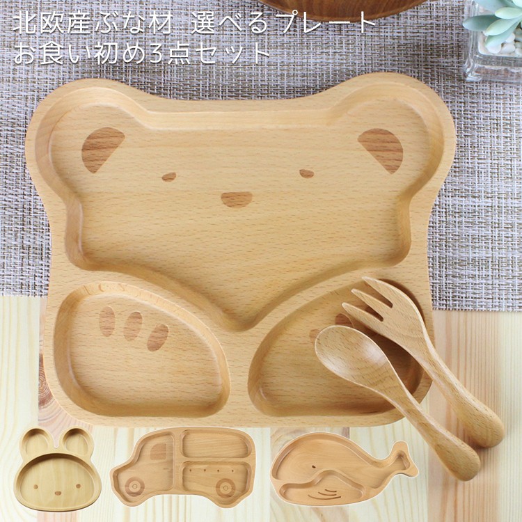 お食い初め 子ども食器セット(ぶな) 選べるプレート&スプーン・フォーク 3点セット 北欧産ブナ材 44287-6