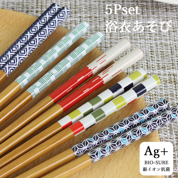 郵送で送料無料 箸 浴衣あそび 5膳セット 23cm 銀イオン 抗菌箸 来客箸 国産 日本製 お箸