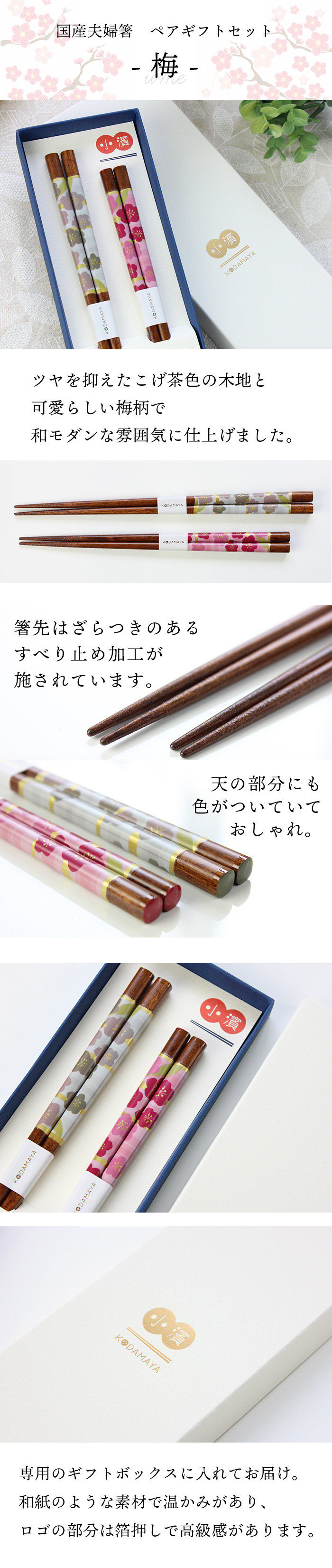 郵送で送料無料 食洗機対応 夫婦箸 梅 ペア 紙箱入り 日本製 お祝い プレゼント 母の日 父の日 敬老の日 ギフトセット