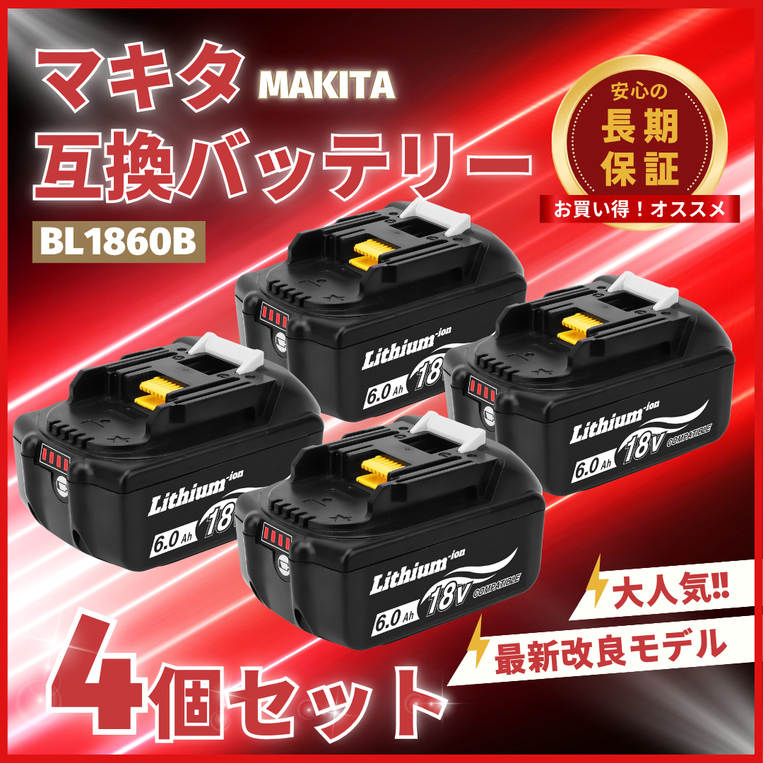 マキタ 互換 バッテリー BL1860B 18v makita 6.0Ah 互換 DC18RC DC18RA DC18RF DC18RD BL1830 BL1830B BL1850 BL1860 電動 保証付き (BL1860B/4個)