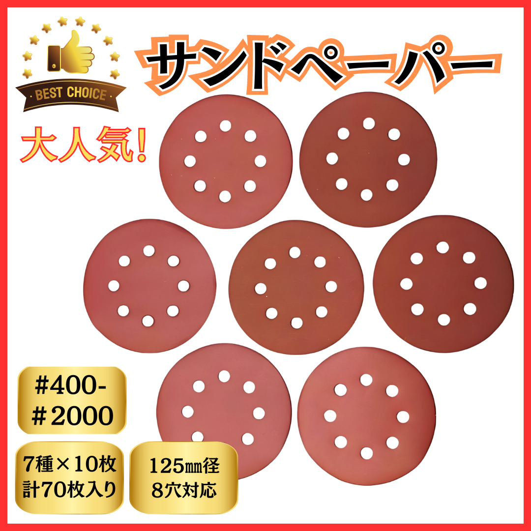 サンドペーパー 125mm 径 8穴 電動 サンダー サンディング ディスク #400-2000 70枚セット やすり サンダーペーパー 研磨 ヤスリ マジックテープ (SAP7001)