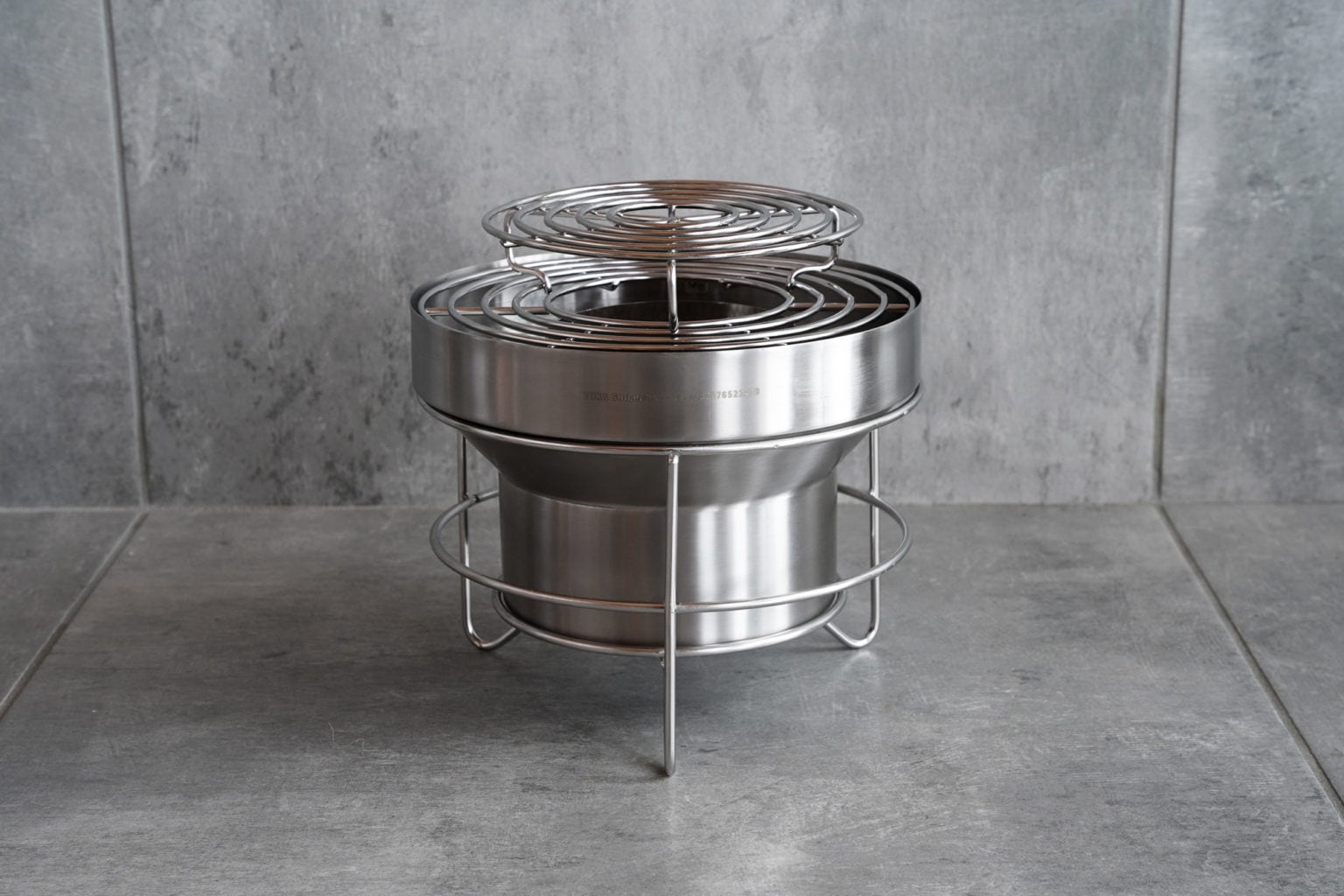 着火・消火・再着火を本体だけで行えるステンレス製の進化型七輪。クラウドファンディングで1,880人から3,200万円以上の支援を集めた注目アイテムです。